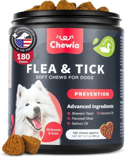 Dog Flea and Tick Treatment Chews – Natural Soft Treats – Flea and Tick Prevention Control for Dogs – Chewable Immune Support Supplement with ACV, Vitamin B Blend, Salmon Oil – All Breeds and Ages