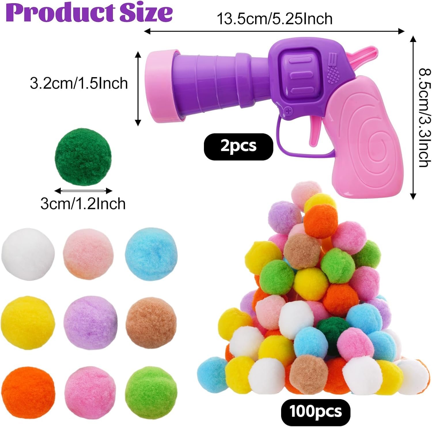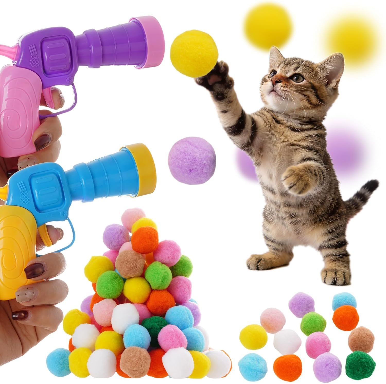 100Pcs Cat Pom Pom Balls with 2Pcs Cat Toy Launchers, Cat Toys Balls Launcher Launch Ball Interactive Toy Silent Plush Elastic Ball for Kitty