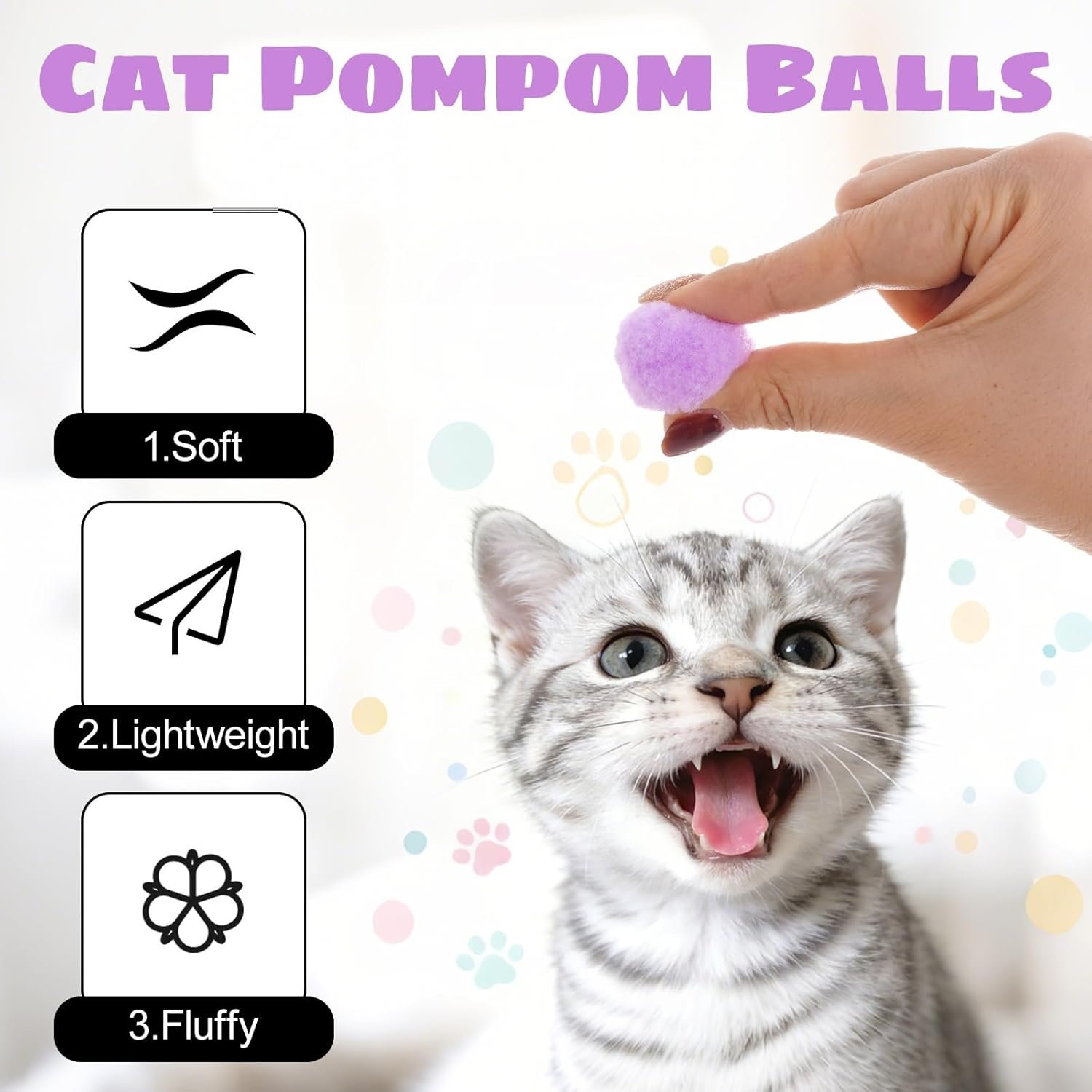 Soft Pom Pom Balls: The set comes with 100 pom pom balls in a delightful mix of colors, each measuring about 1.2 inches in diameter. These lightweight soft balls are gentle on your cats teeth and paws and safe for your home furnishings, providing a worry free interactive play experience that cats find irresistibly engaging