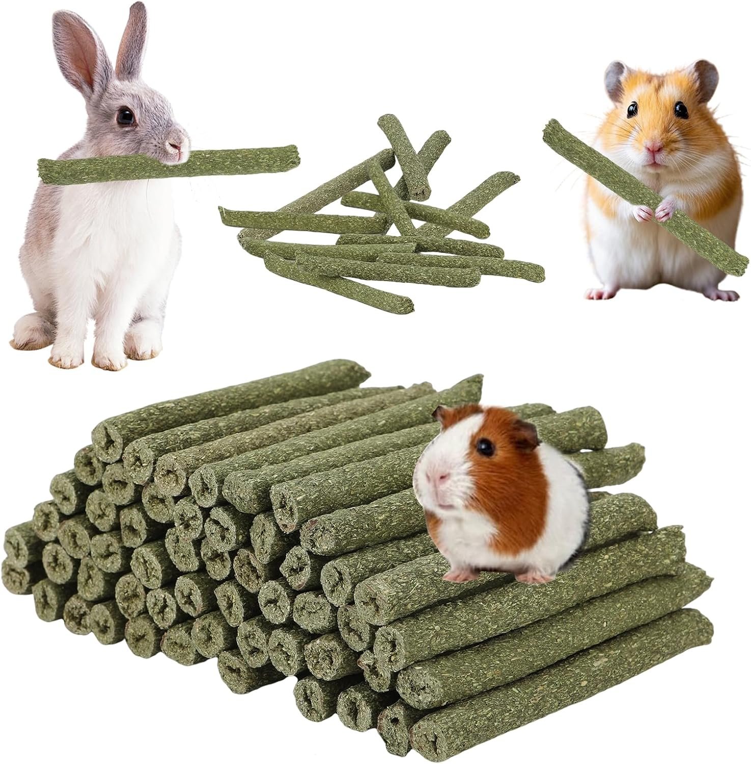 ● Timothy hay sticks treats give your pet more fiber to improve intestinal peristalsis and promote digestion. Unique hardness through high temperature molding attacts small pets grinding their teeth and improving dental health and maintain their chewing habits.