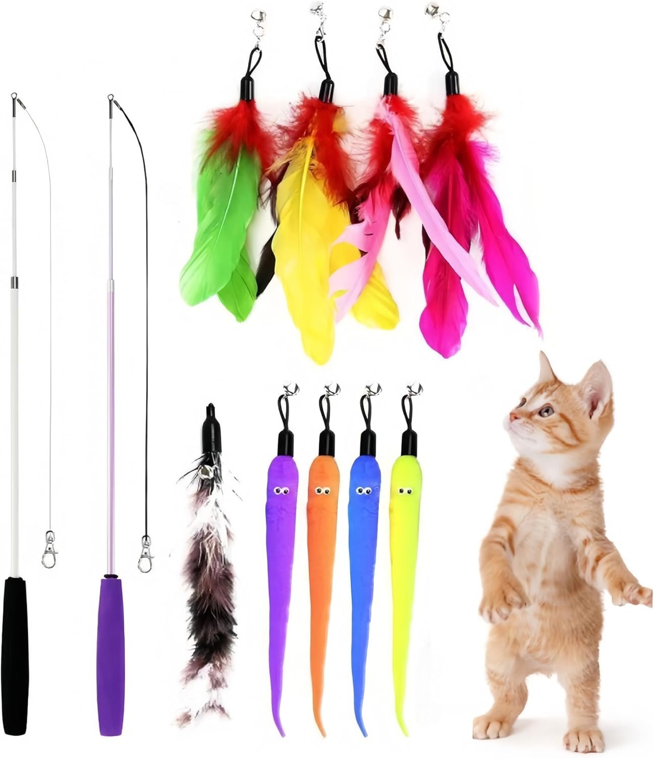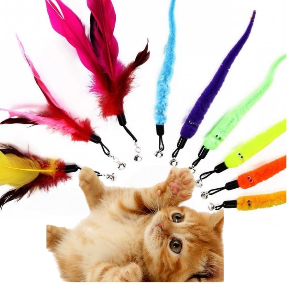 Optional replacement: With 9 pcs different feather and worm replacement teaser with bells, increase kitten’s interest and stimulate cat’s sense. Multi feathers and worms refills have more play options and more fun