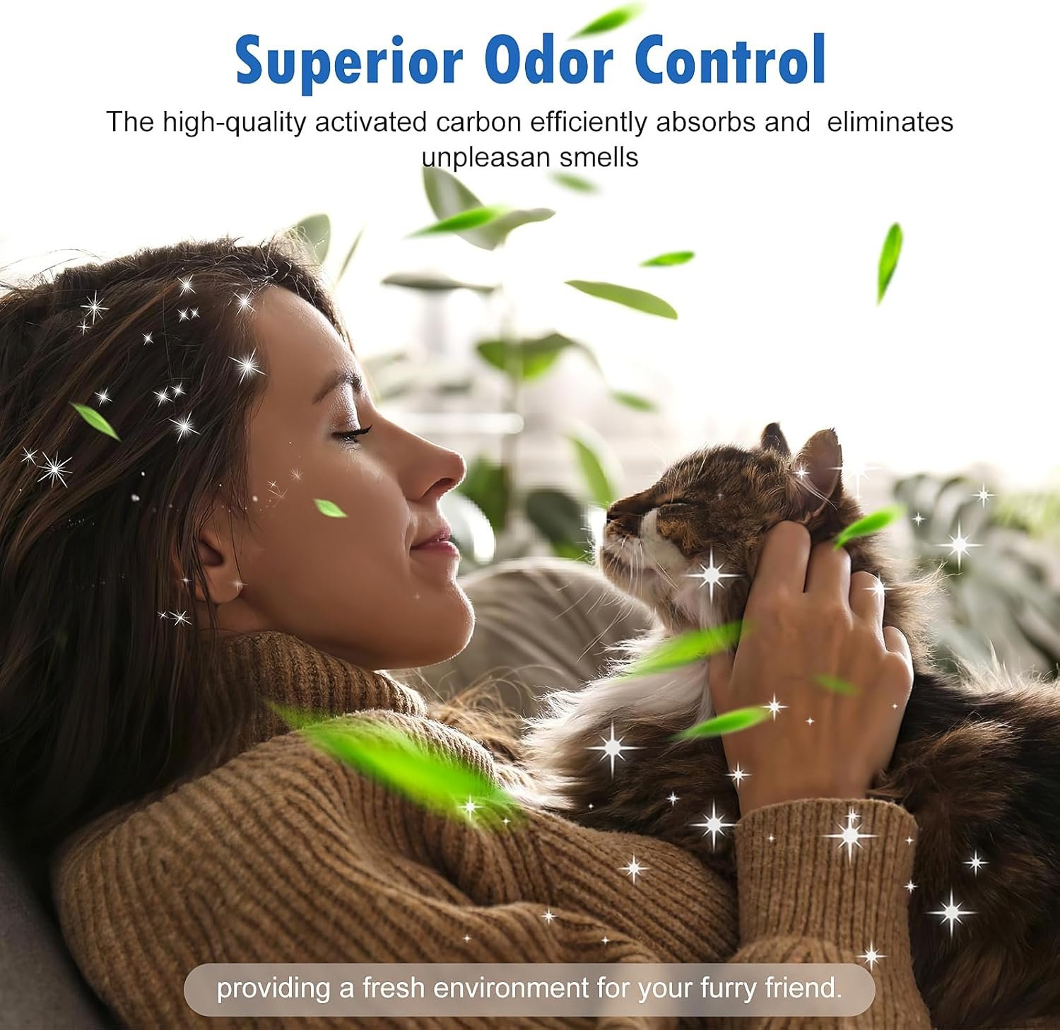 🐱[Eliminate unpleasant odors]: Our Cat litter box replacement filters are equipped with activated carbon and manganese sand, effectively adsorbing and filtering urine and fecal odors to maintain a fresh and clean scent in your home