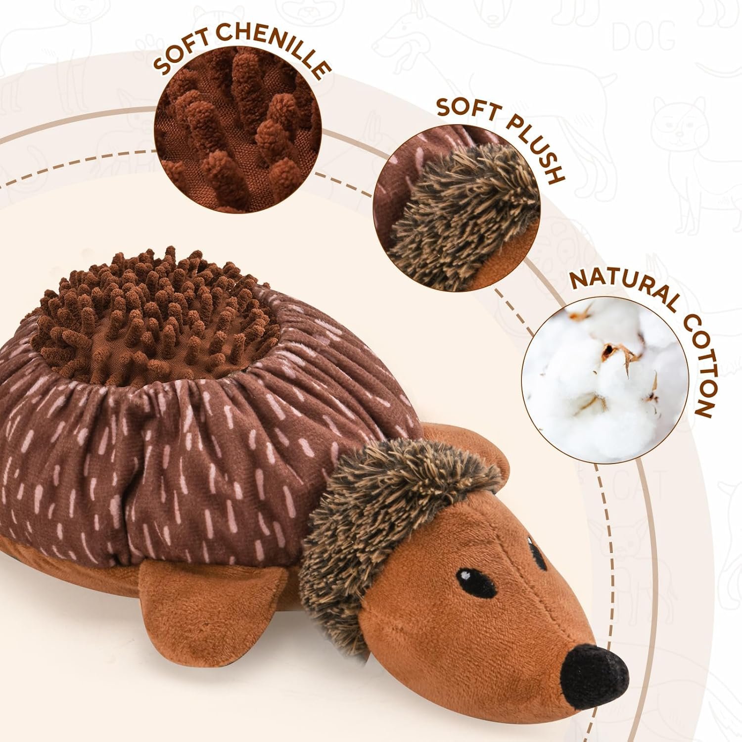 【Note】This hedgehog dog toy is not recommended for powerful chewers. Always supervise playtime, and if your dog shows aggressive chewing behavior, redirect their attention to the treat-seeking or squeaker features to help protect their safety and prevent them from swallowing any stuffing.