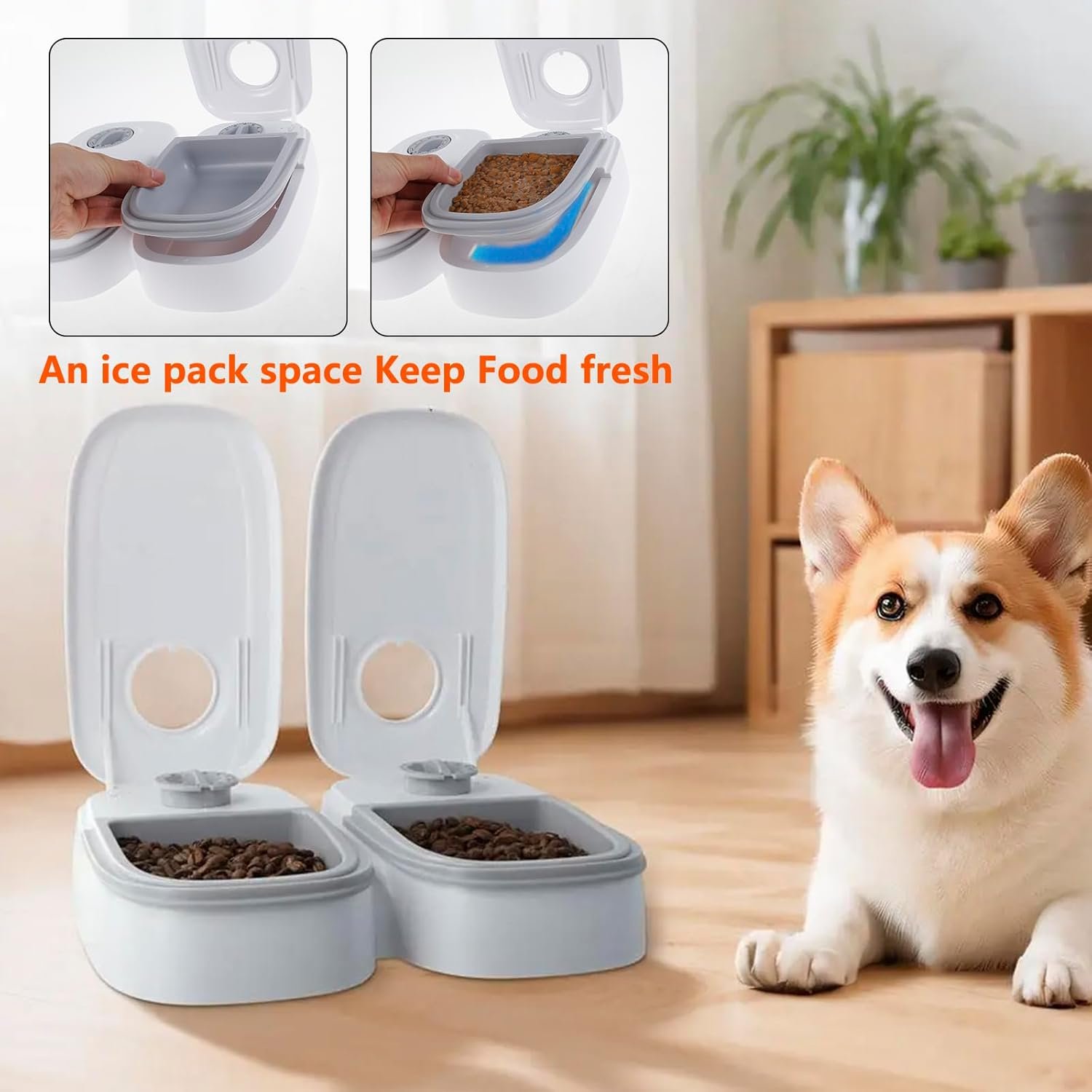 【2 Meal Spliter】This 2 meal automatic pet feeder features 2 bowl design, each bowl holds up to 12.4 oz (350 ml) of dry or semi-moist food. Suitable for cats and small to medium sized dogs that helps you with your regular ration feeding schedule. The bottom is designed with a space for placing ice pack, which helps to keep food fresh.
