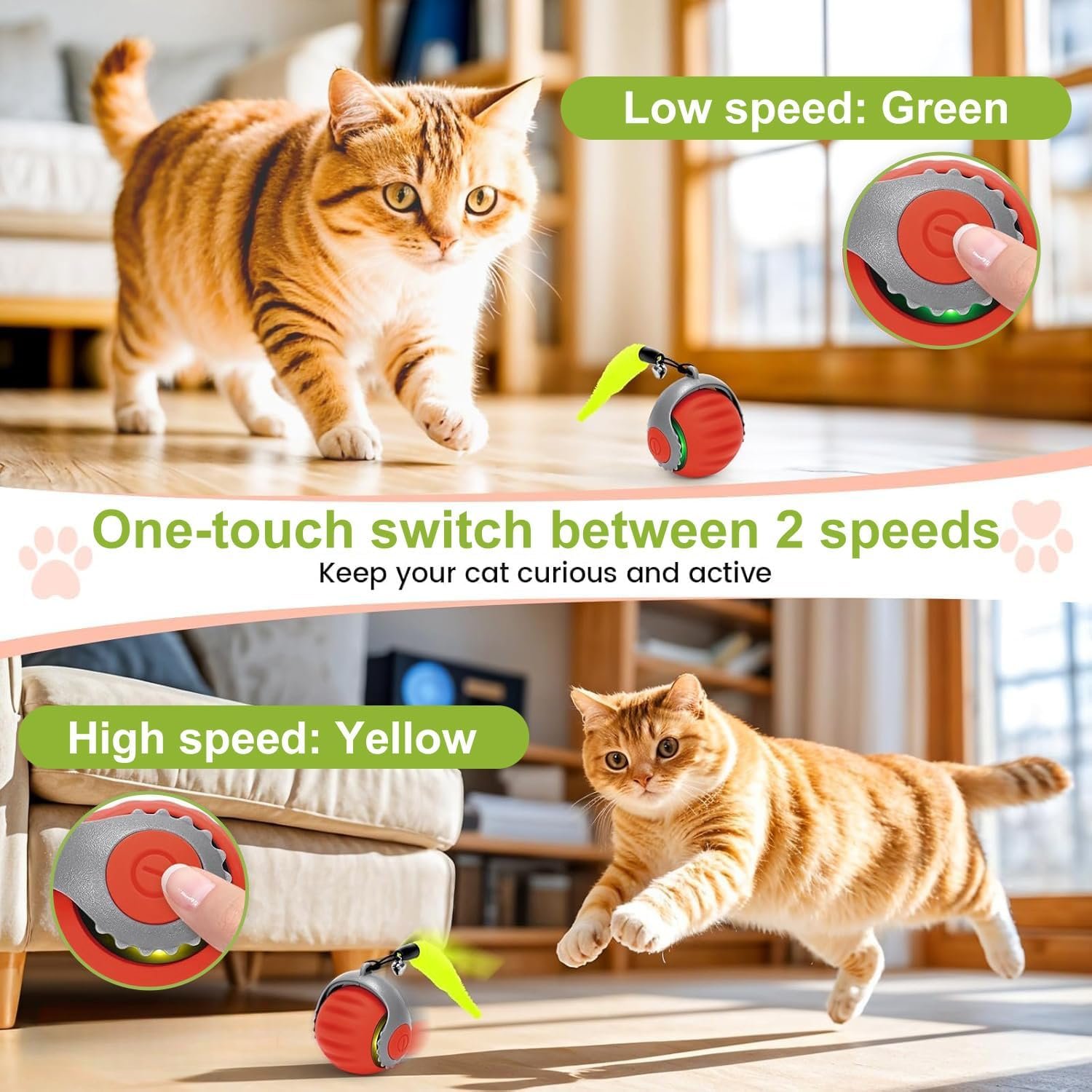 Two Modes: Toggle between low and high-speed settings with just a short press on the button. Green indicates low speed, Yellow indicates high speed. After running for five minutes, it enters standby mode, need motion activated cat toy; be careful! It’s not that the battery is running out! Whether your adult cat or kitten prefers a slow roll or speedy action, this interactive cat ball toy adapts to their activity level for non-stop exercise and enrichment, catering to your cat’s needs
