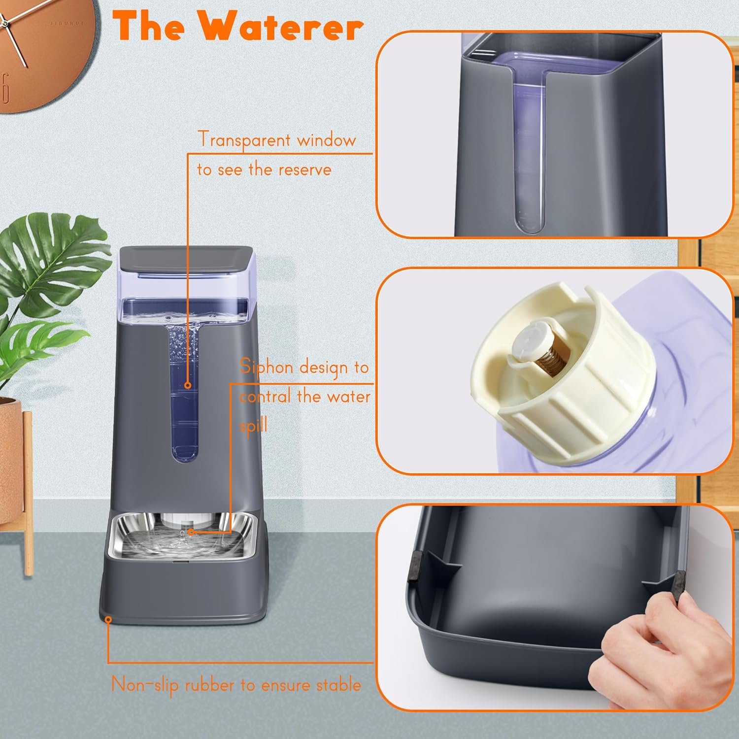 Siphon Device Design Prevent Water Leakage: When the water in the water tank of the cat water dispenser reaches a certain height, the spring device in the middle of the barrel mouth will automatically close, and the water will stop flowing, so it can effectively prevent water leakage; When the water is consumed by pets and is below a certain height, the spring device will automatically open and the water will continue to flow into the water tank