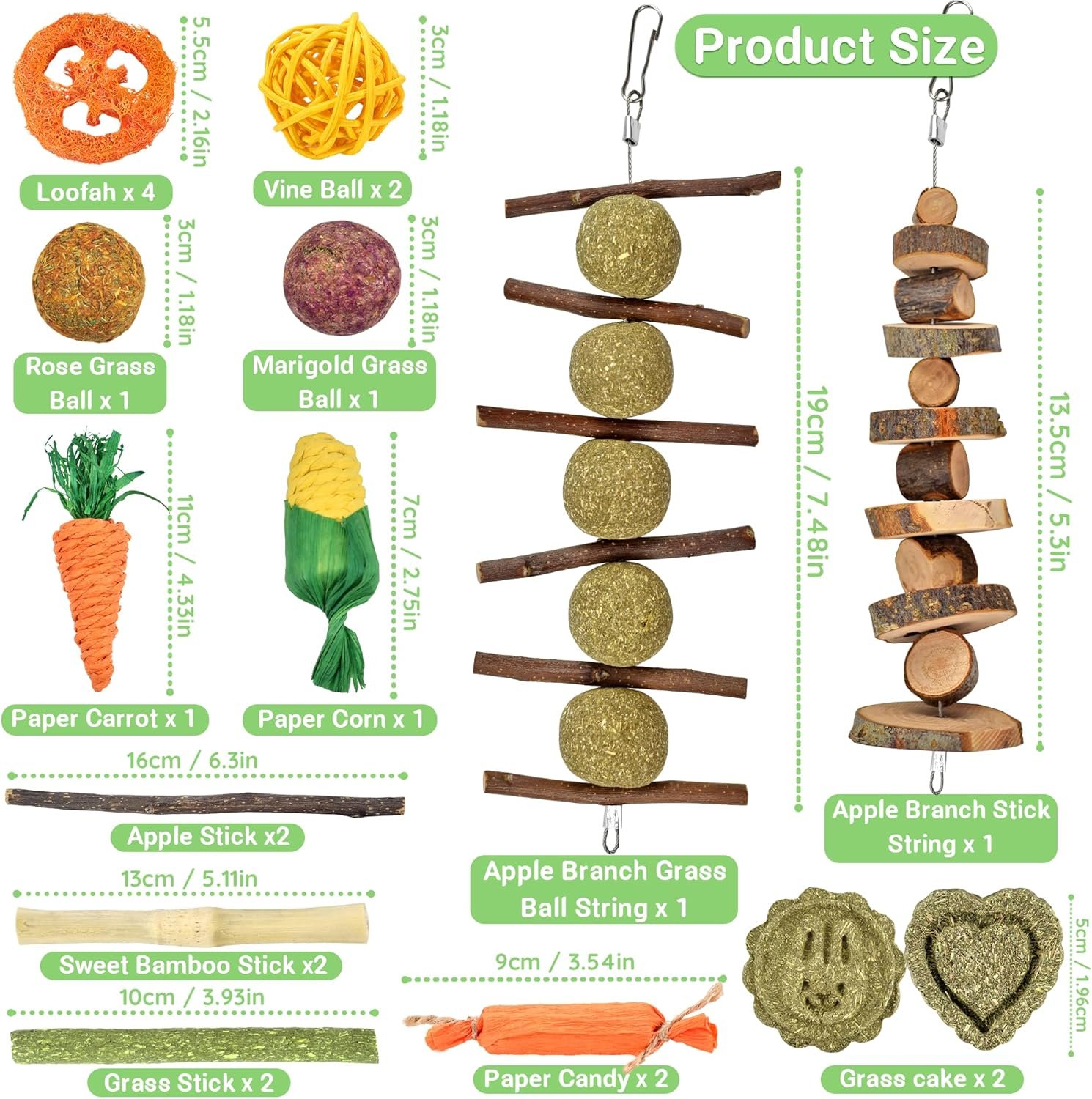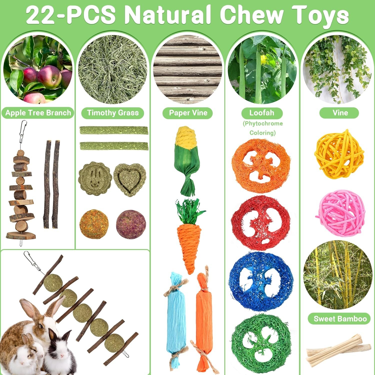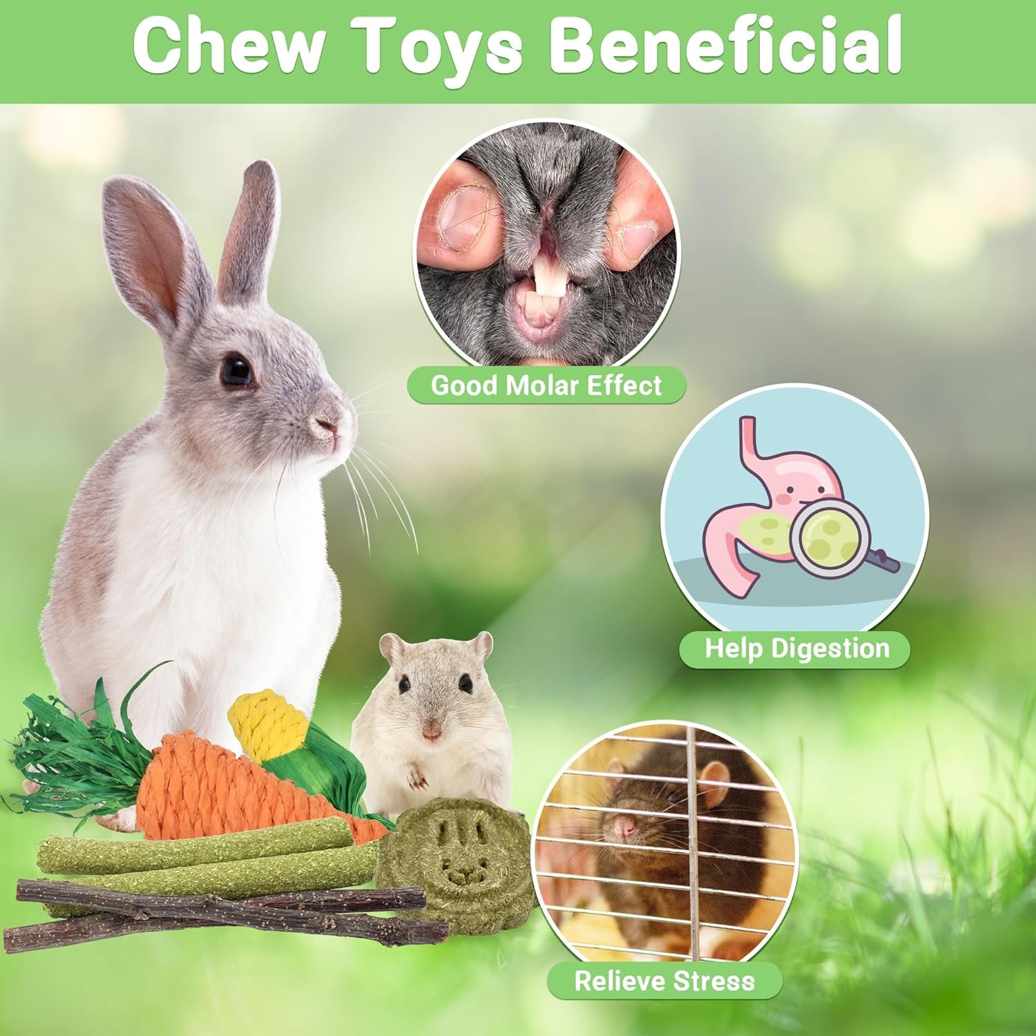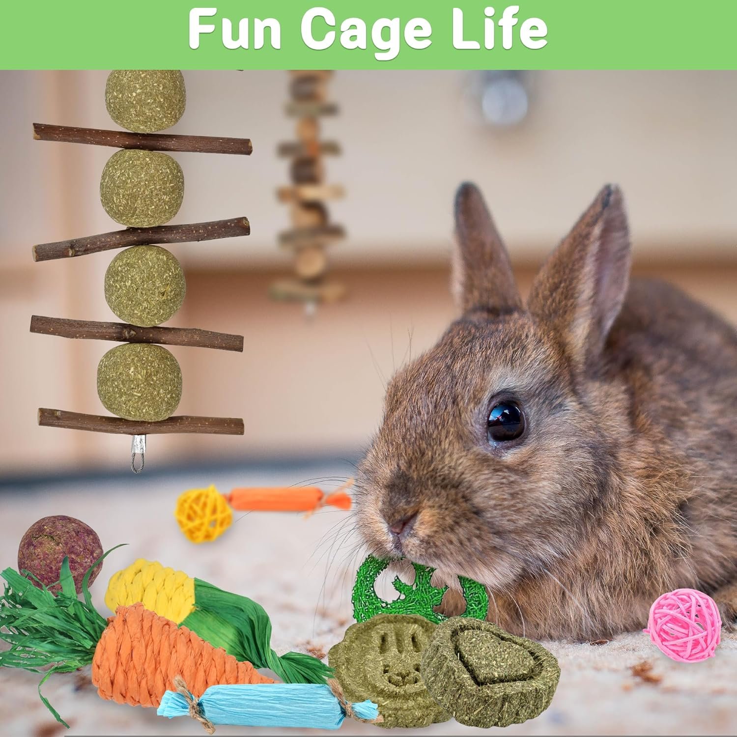 22-Pack Rabbit/Hamster Toys Set : This versatile set includes boredom breakers and teething toys for small animals like rabbits, hamsters, guinea pigs, and chinchillas. It helps prevent destructive chewing on cages while promoting dental health.