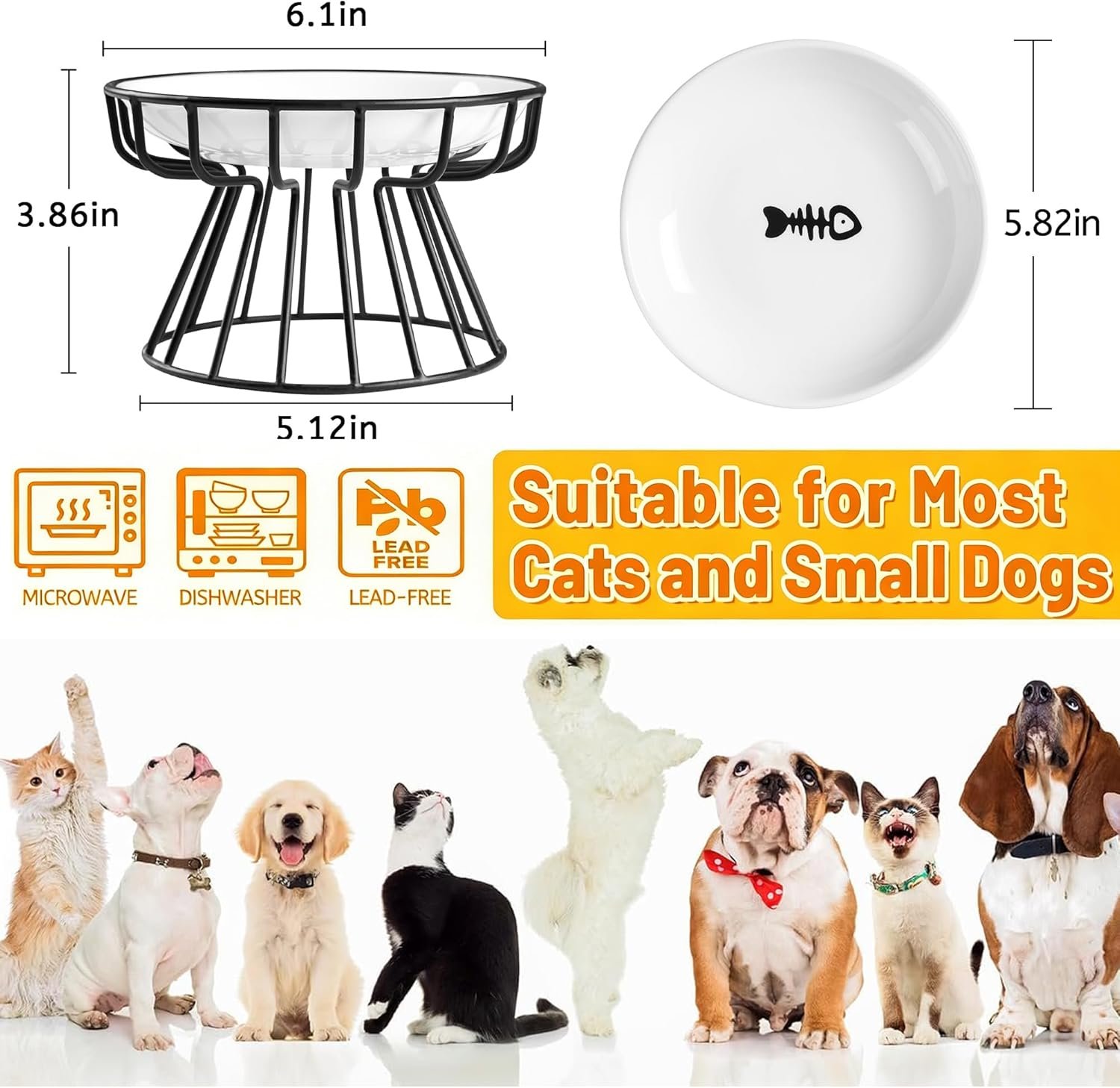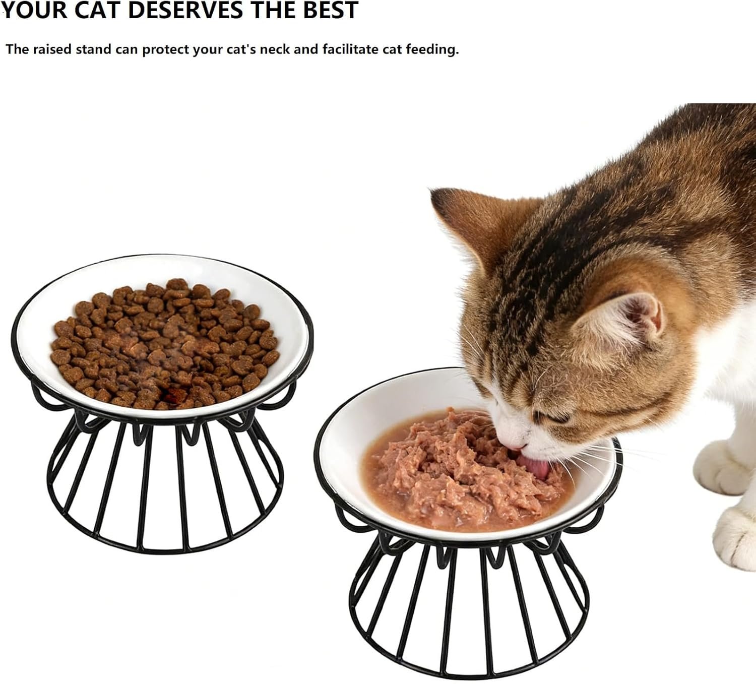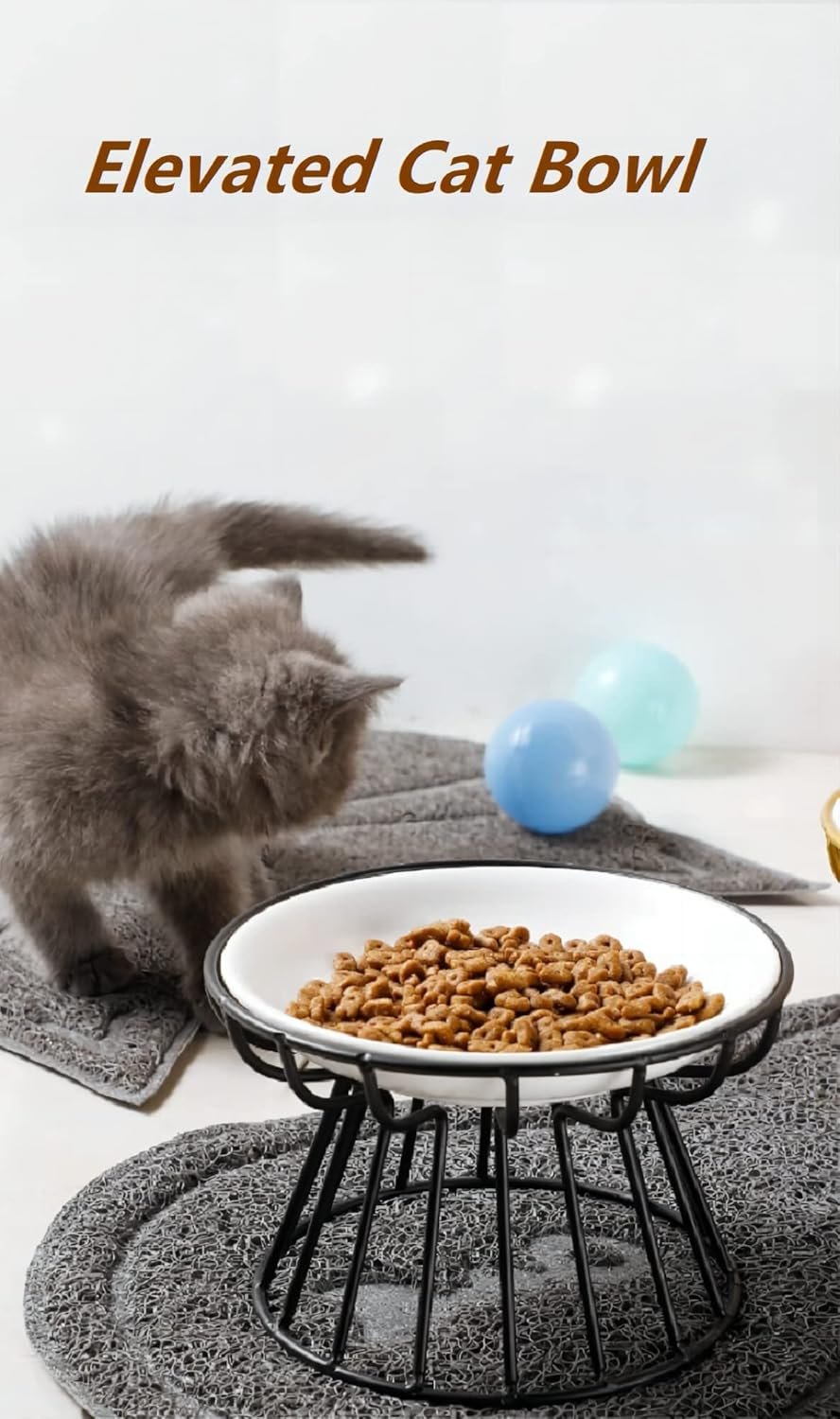 Flexible design : The ceramic cat bowl adopts a flexible design, with a metal bracket and ceramic cat food tray that can be separated, making it easy to carry and use. The capacity is 12 ounces, suitable for puppies,kittens, or other pets