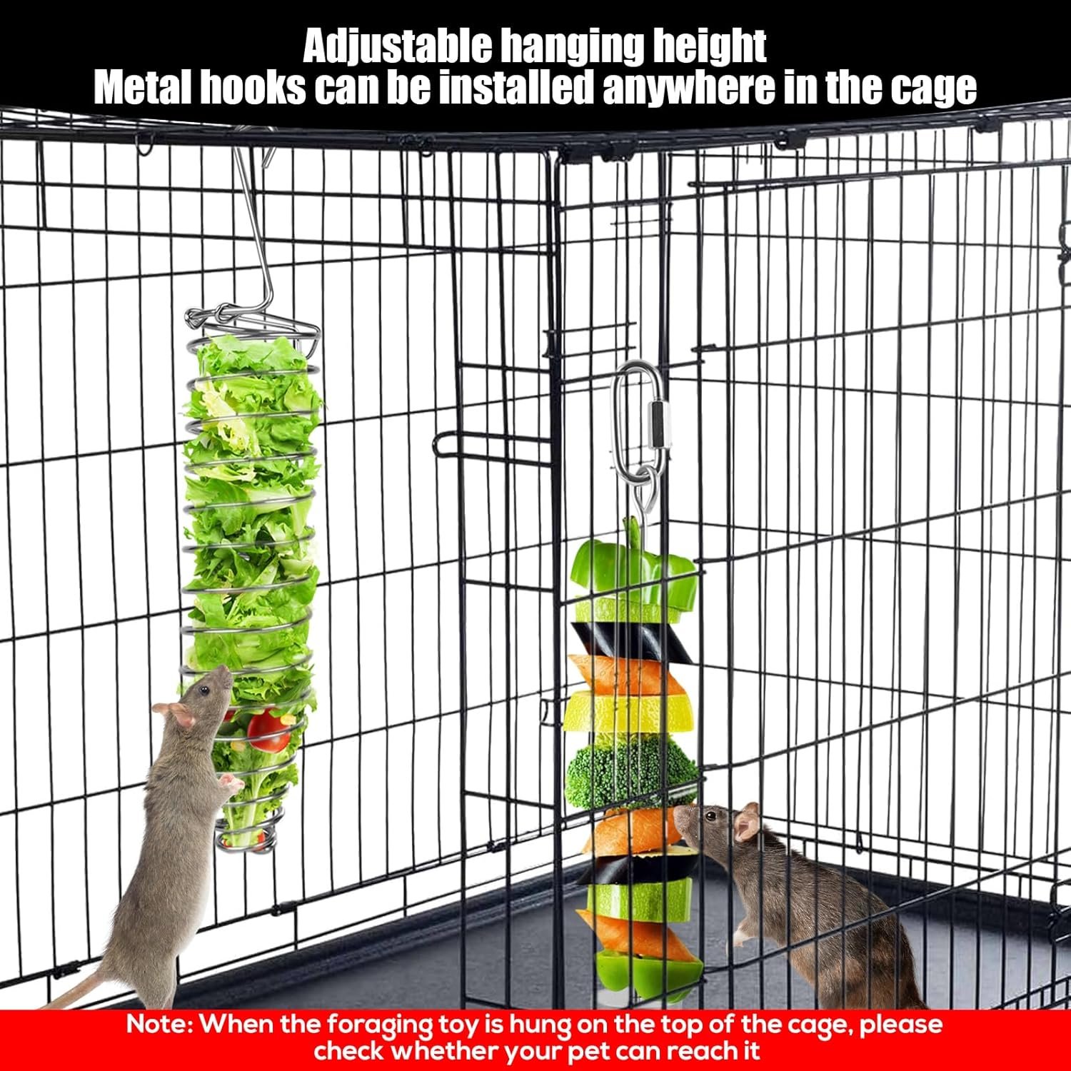 Easy to Install: The rodent slow feeder is equipped with strong metal hooks for easy installation anywhere in the cage. The height is adjustable to keep food off the cage floor. Tip: Make sure your pet can reach the toy.