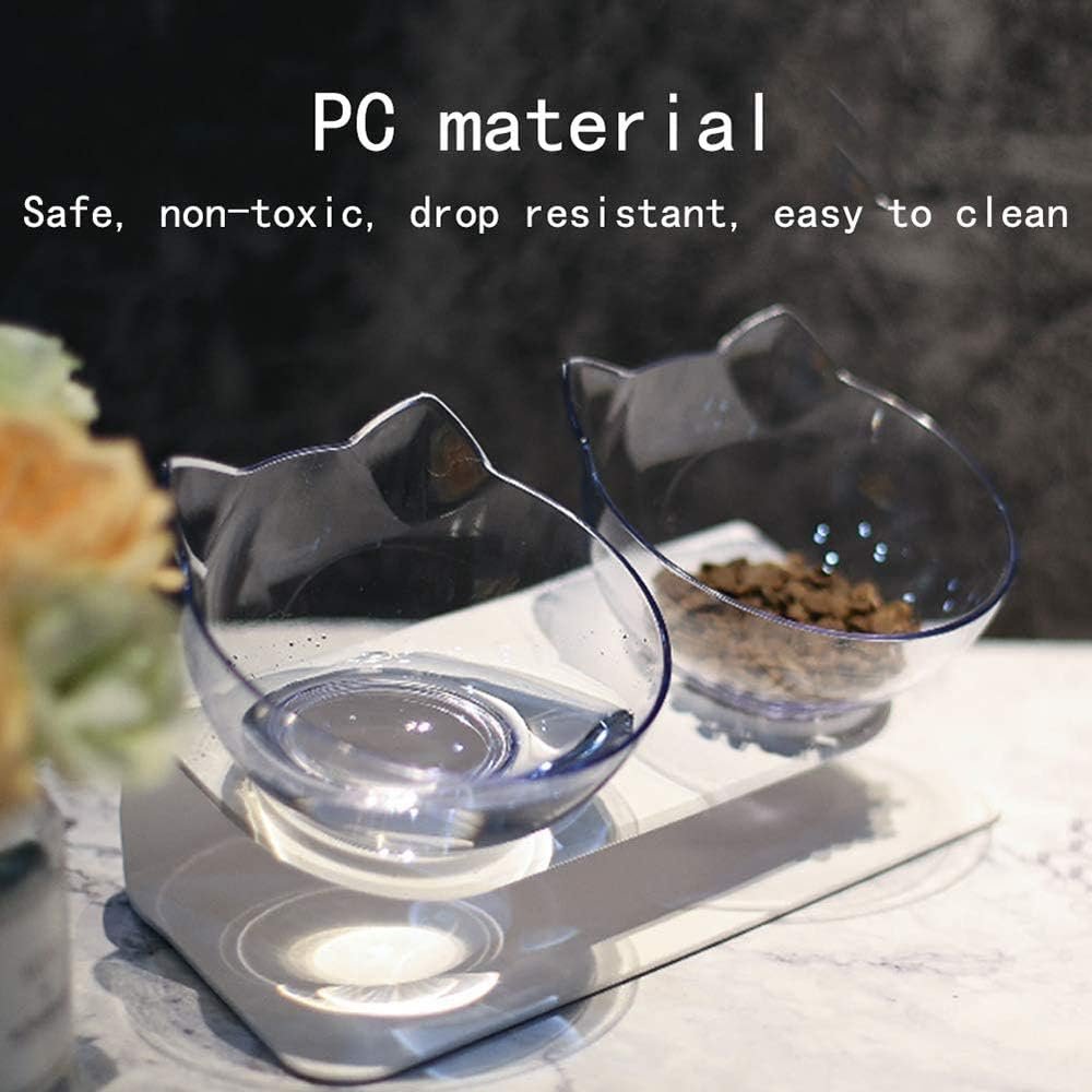 【Double Bowls】The cat food and water bowl 2 in 1 in large oblique rim reduce cat food dropping and are suitable for flat-faced cats. Transparent bowls can control the amount of food, which design for small dogs and cats.