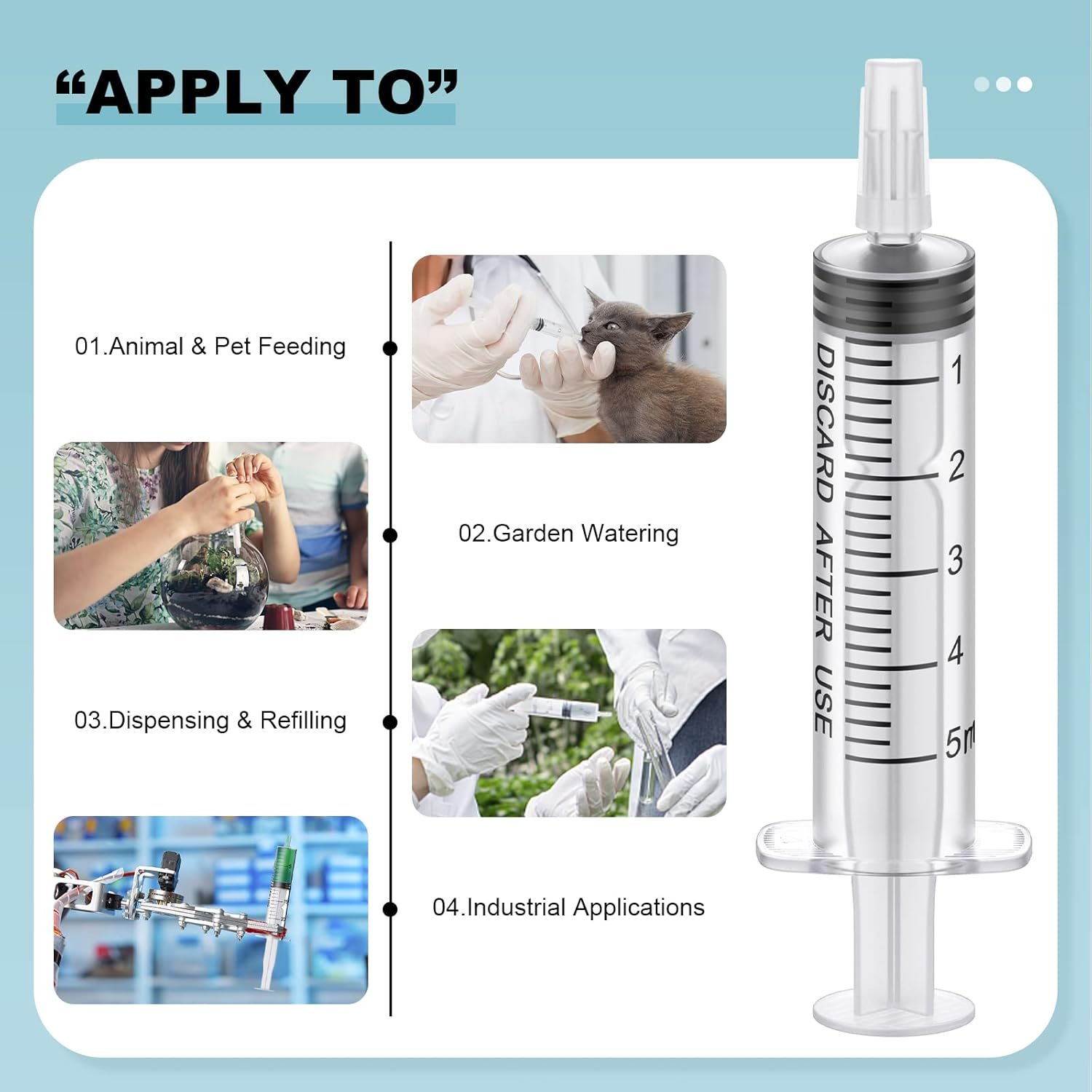 【Wide Application】These liquid measuring sterile syringes are suitable for providing liquid feeding for your dogs, cats, birds and other small pets, and for measuring the nutrients of your garden plants. Also suitable for wood adhesive, glue injector, essential oil dispenser, ink transfer and refilling, etc.