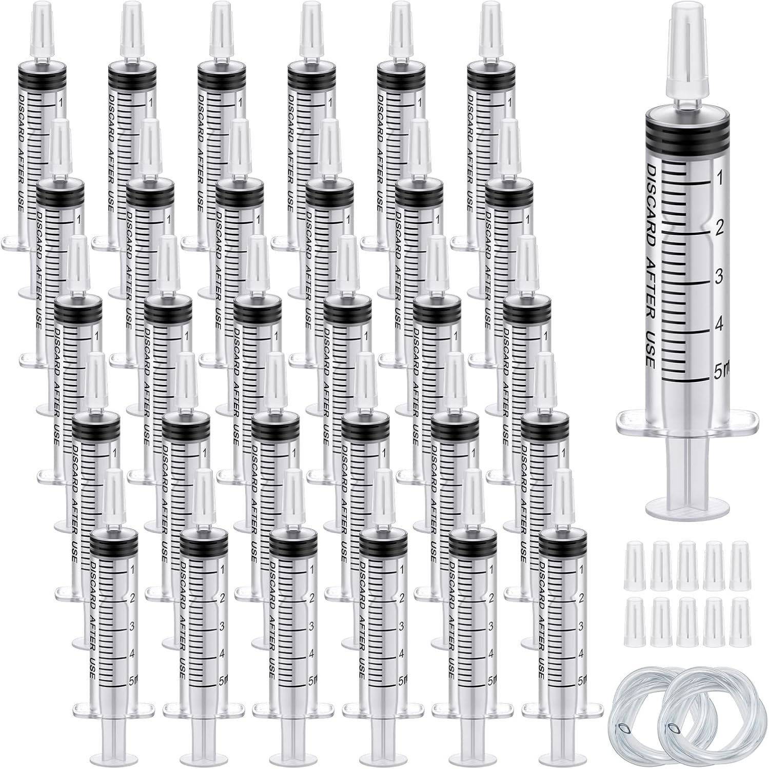 【Package Includes】30 pcs 5 ml syringes without needle, each sterile syringe comes with a tip cap. In addition, you will also receive 10 extra tip caps and 2 pcs 11.81 inch (30cm) soft tube, enough for use or replacement