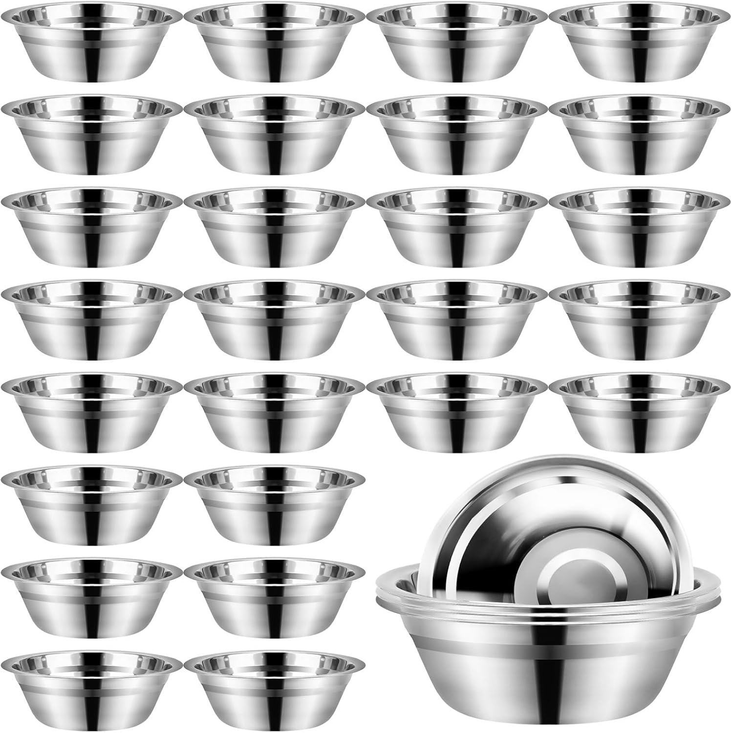 Value Pack: Our pack contains 30 stainless steel bowls, enough for your everyday use and replacement. Our metal prep bowls have a top diameter of 5.9 inches and a capacity of 0.52 quarts. They are perfect for holding fruit, snacks, popcorn and eggs, and are ideal for mixing salads, marinating meat and making tasty sauces and dressings