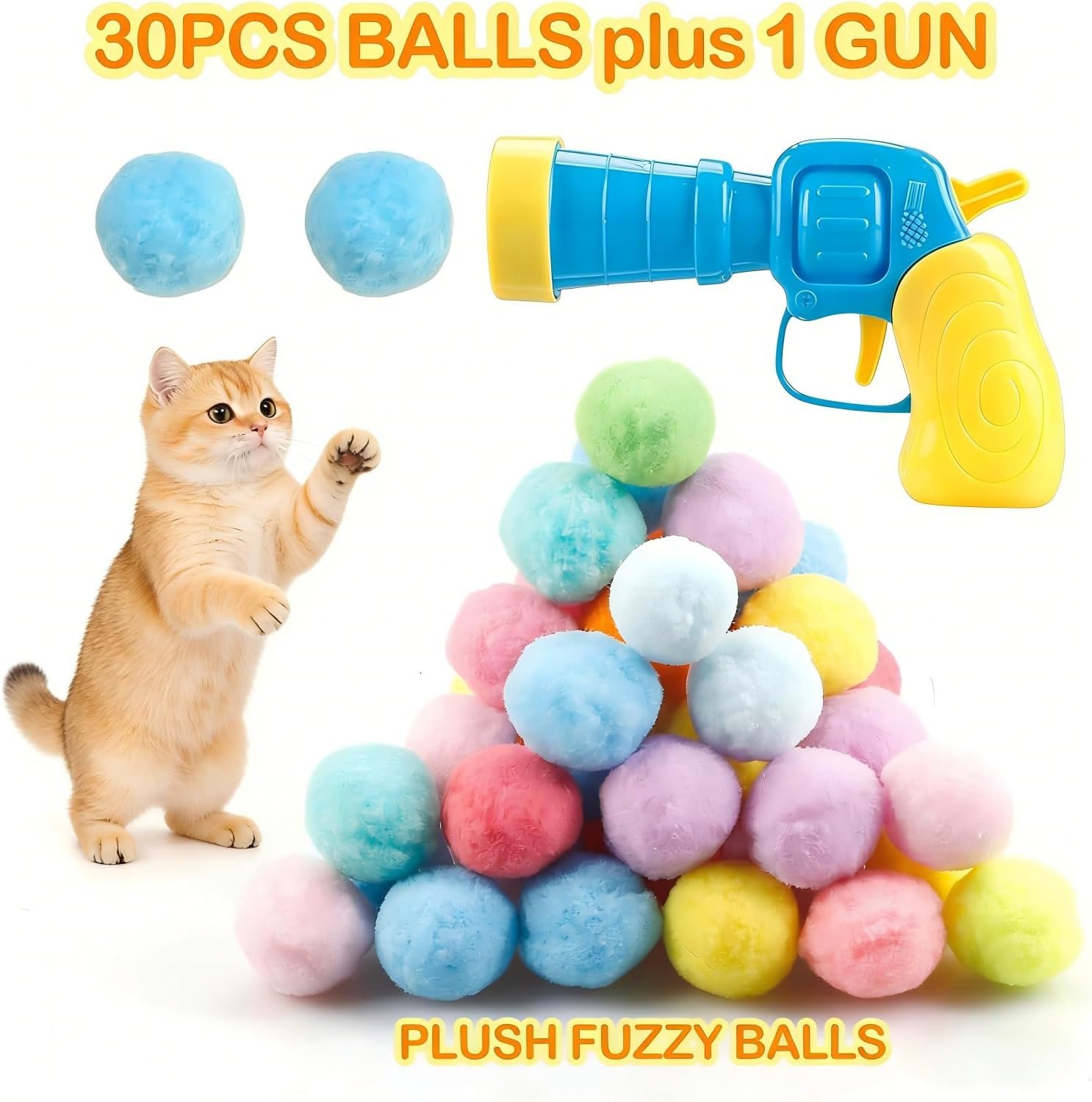 30Pcs Cat Ball Toy Launcher Gun, Cat Balls Fetch Toy, 30Pcs Plush Fuzzy Balls Launcher Cat Toy for Cats with 1 Gun, Funny Interactive Cat Toys for Bored Indoor Adult Cats, Cute Kitten Kitty Toys