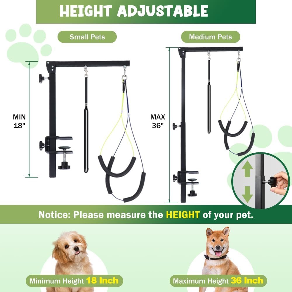Height Adjustable: Easily adjust this dog grooming arm up to 36 inches using two knobs, positioning your pet at a comfortable height. The sturdy clamp fits grooming table up to 1.6 inches thick. Pet grooming table arm is ideal for small and medium sized pets