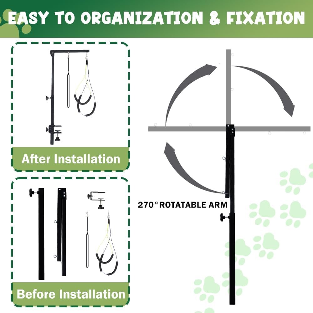 Perfect for Pet Grooming: Our pet grooming table arm comes with one comfortable grooming hammock for easy nail trimming. Sturdy no sit hump holders and pet grooming loop restrain your furry friend without causing injury. Adjustable length suitable for your four legged friend