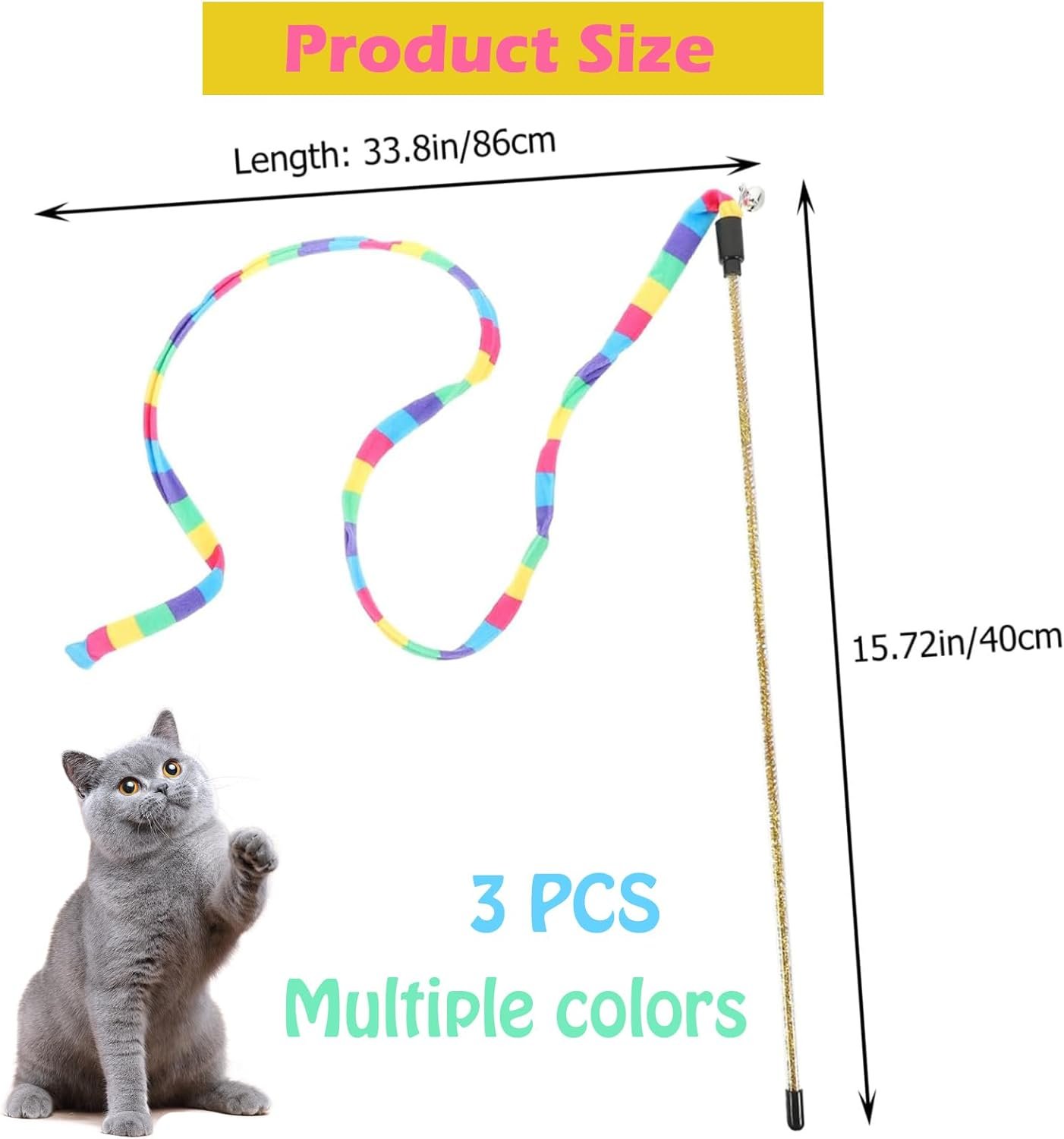 PERFECT SIZE : The rod length of each interactive cat wand toy is 40 cm/15.7 inches, with a 87 cm/34.3 inch colorful cat toy rope, which is enough for you to play with your cat freely.
