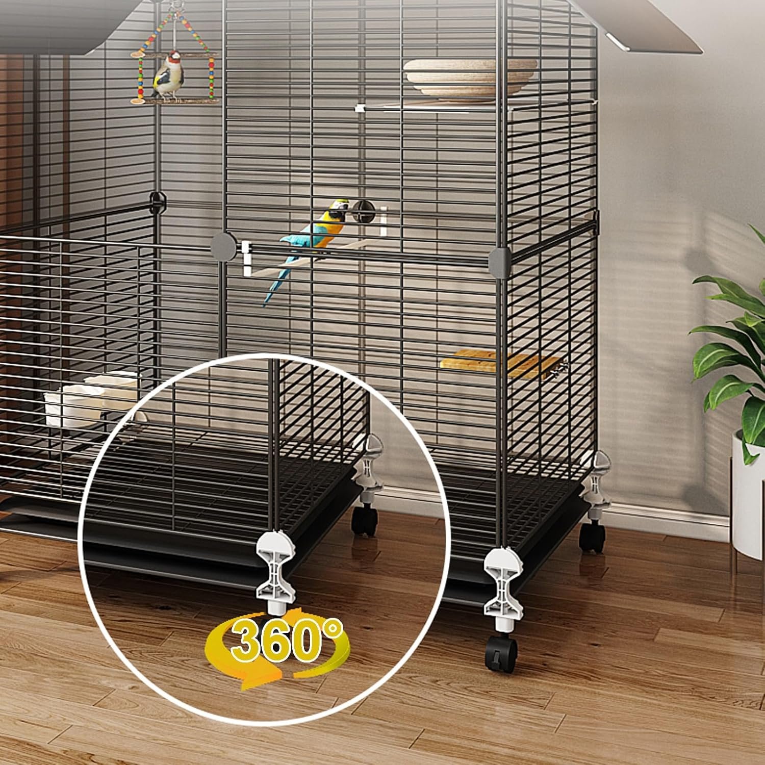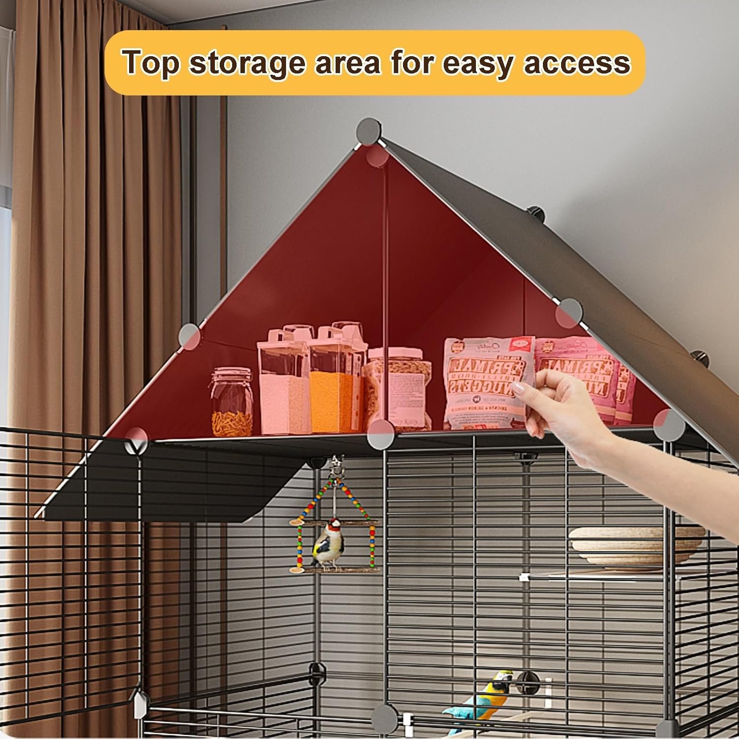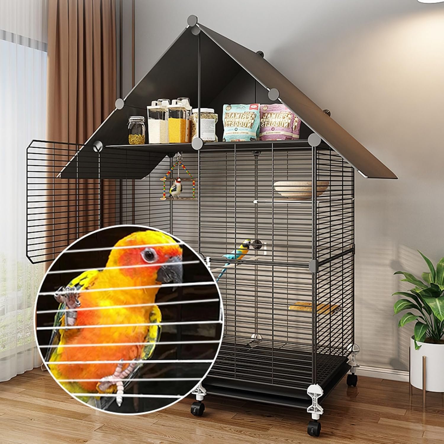 LARGE STORAGE CAPACITY: The spacious storage area on the top, users can place bird-related products, and the triangular design on the top, even if the cage is moved outdoors, it will not get wet, and it can better manage the debris and prevent clutter