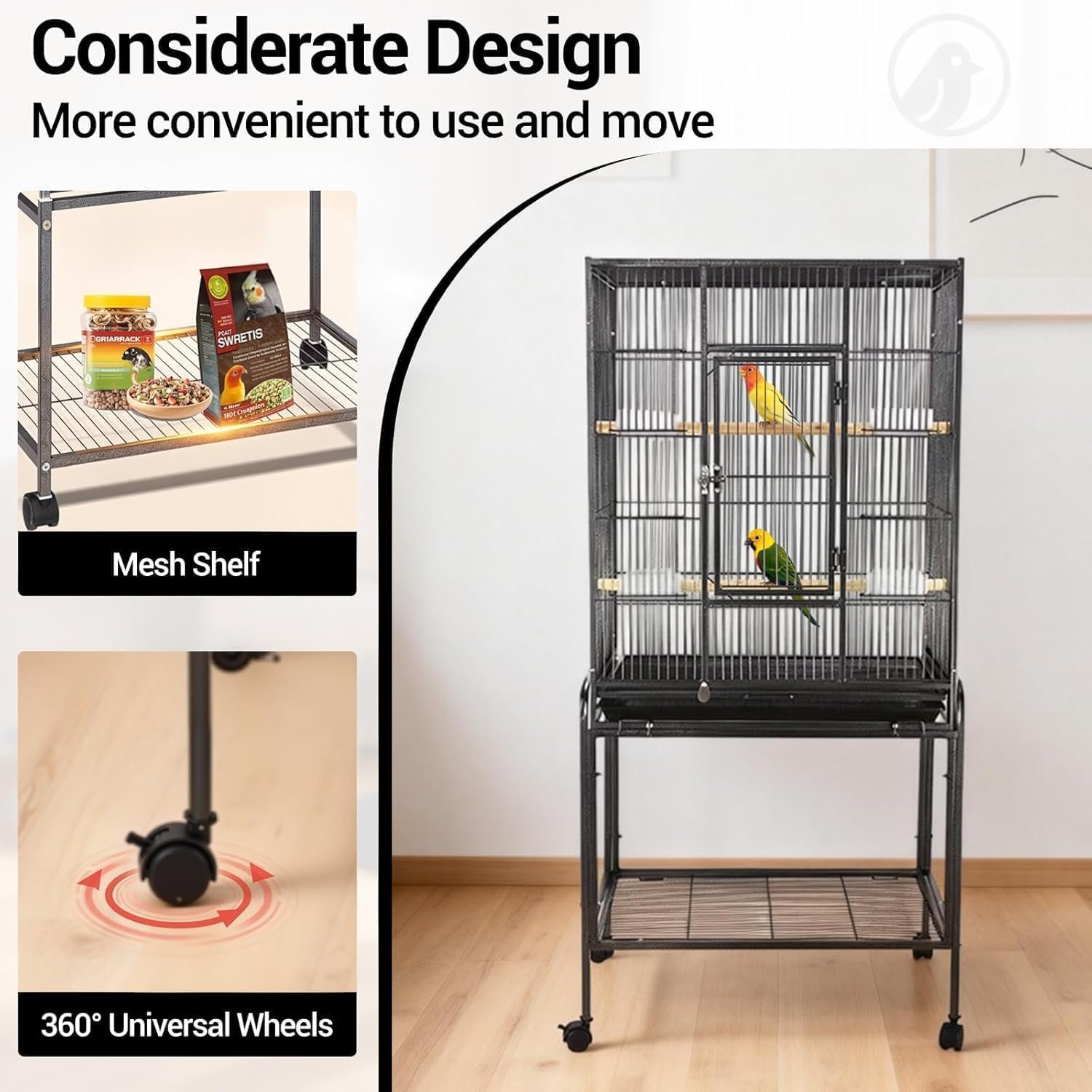 53 Inch Bird Cage with Wheels,Standing Wrought Iron Birdcage with Wooden Perches, Large Parrot Cage Bird Cages with Slide-Out Tray Water Bottle Feeder for Parakeets,Cockatiel