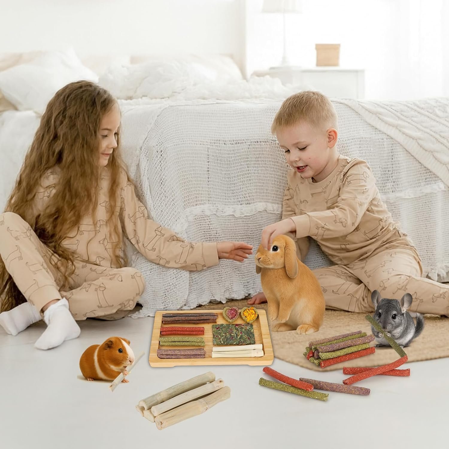 1. rabbit treats is the molar toy of natural sweet bamboo, apple sticks, timothy hay treats, ideal for squirrel, rabbit, chinchilla, guinea pig, hamster and other pets.