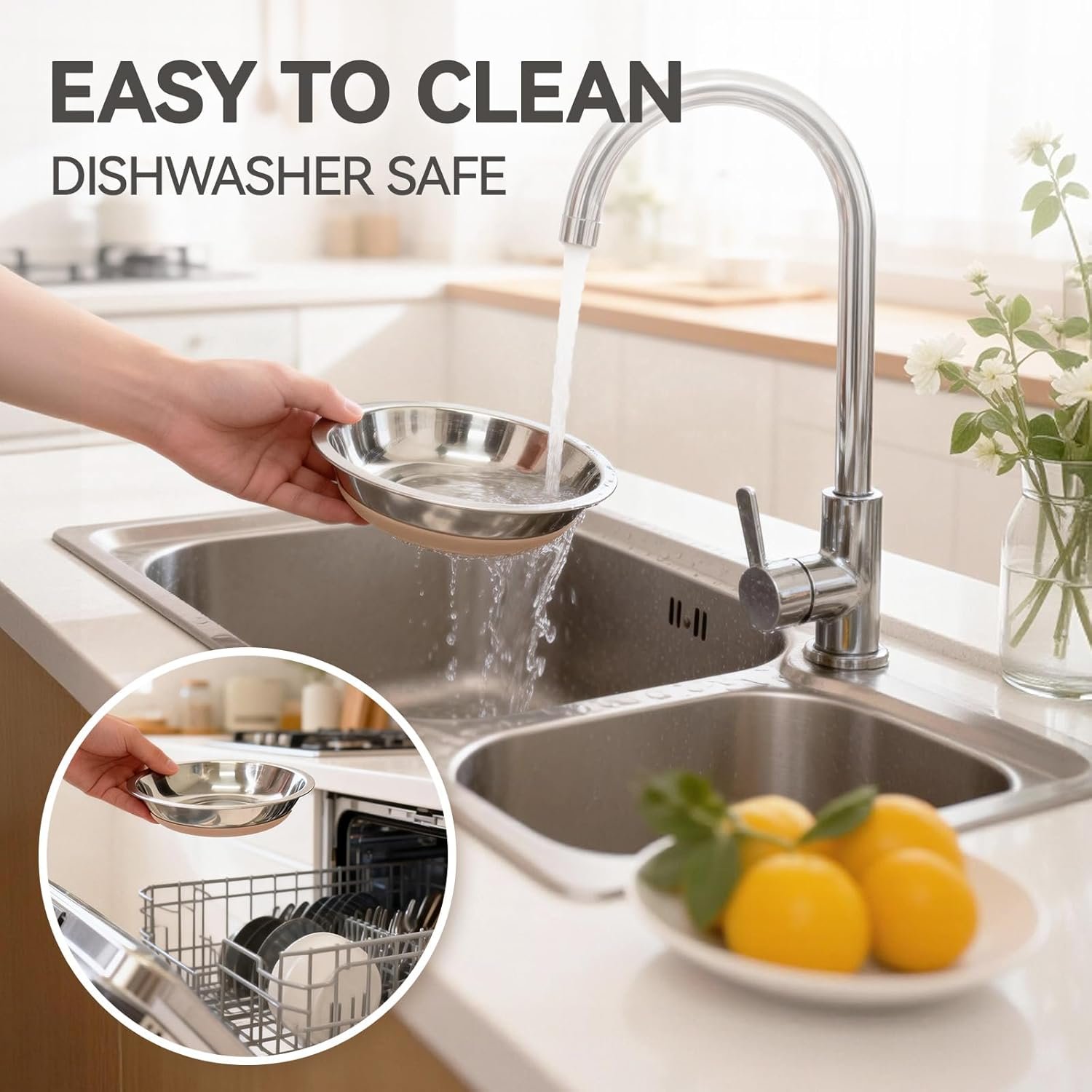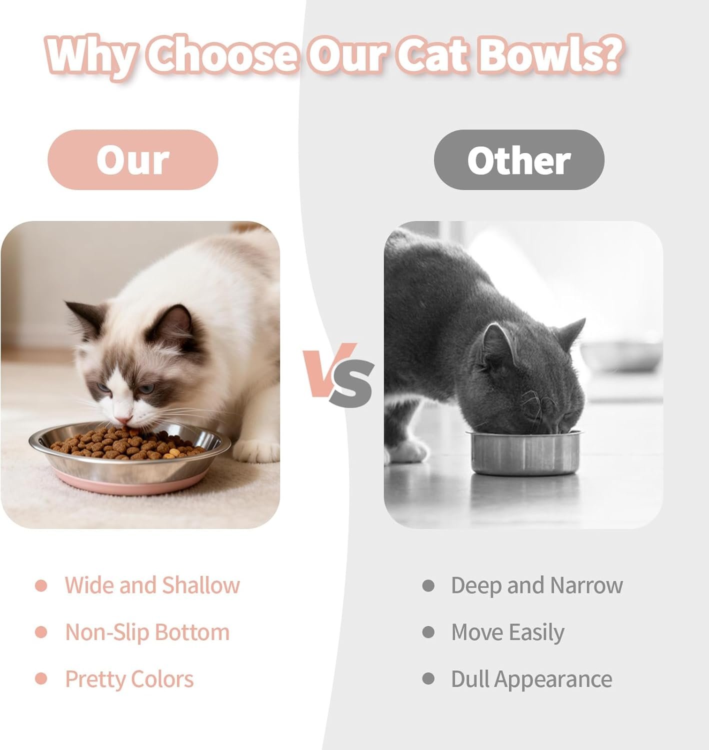 Safe & Easy to Clean: These durable cat food bowls are made of food-grade stainless steel, which is non-toxic and easy to clean. After hand-washing or in the dishwasher, it won’t retain any food odors. Additionally, the bowls are stackable, saving space