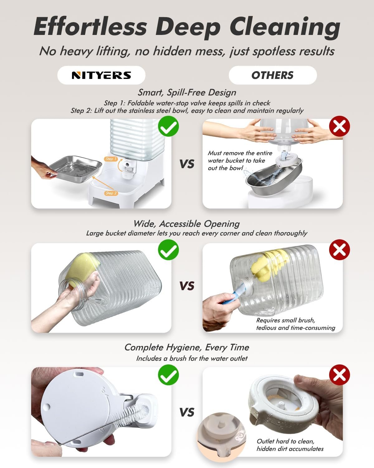 Say Goodbye to Rust Worries: Tired of some cat water dispensers with metal spring valves that are prone to rust? Nityers dog water bowl features a lid entirely made of ABS material, completely eliminating the risk of rust and ensuring it stays like new even after long-term use. For easy cleaning, we include a small brush to help you keep the water channel clean and hygienic, providing a healthier drinking experience for your fur babies