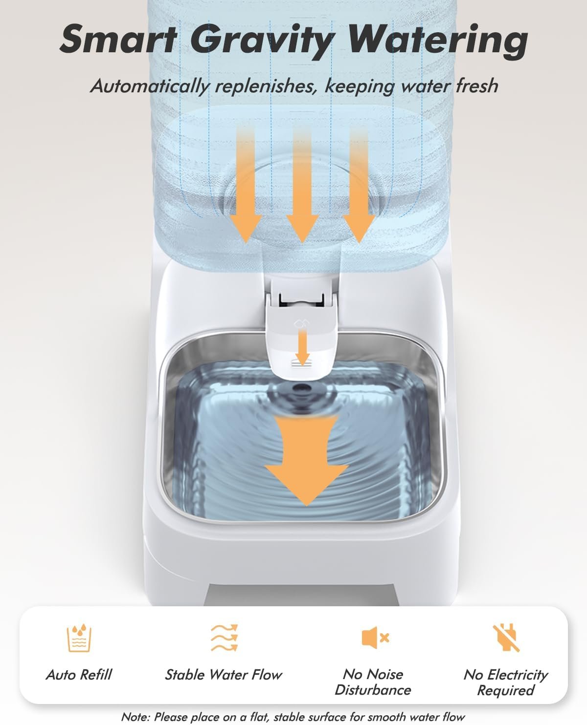 Automatic Gravity Water Replenishment: This gravity-fed automatic cat water dispenser automatically refills the water bowl without electricity, keeping your pets hydrated while freeing your hands. The non-plug-in design allows you to place it anywhere, and motor-free operation ensures quiet, uninterrupted water flow. For optimal performance, always place the dispenser on a flat, level surface