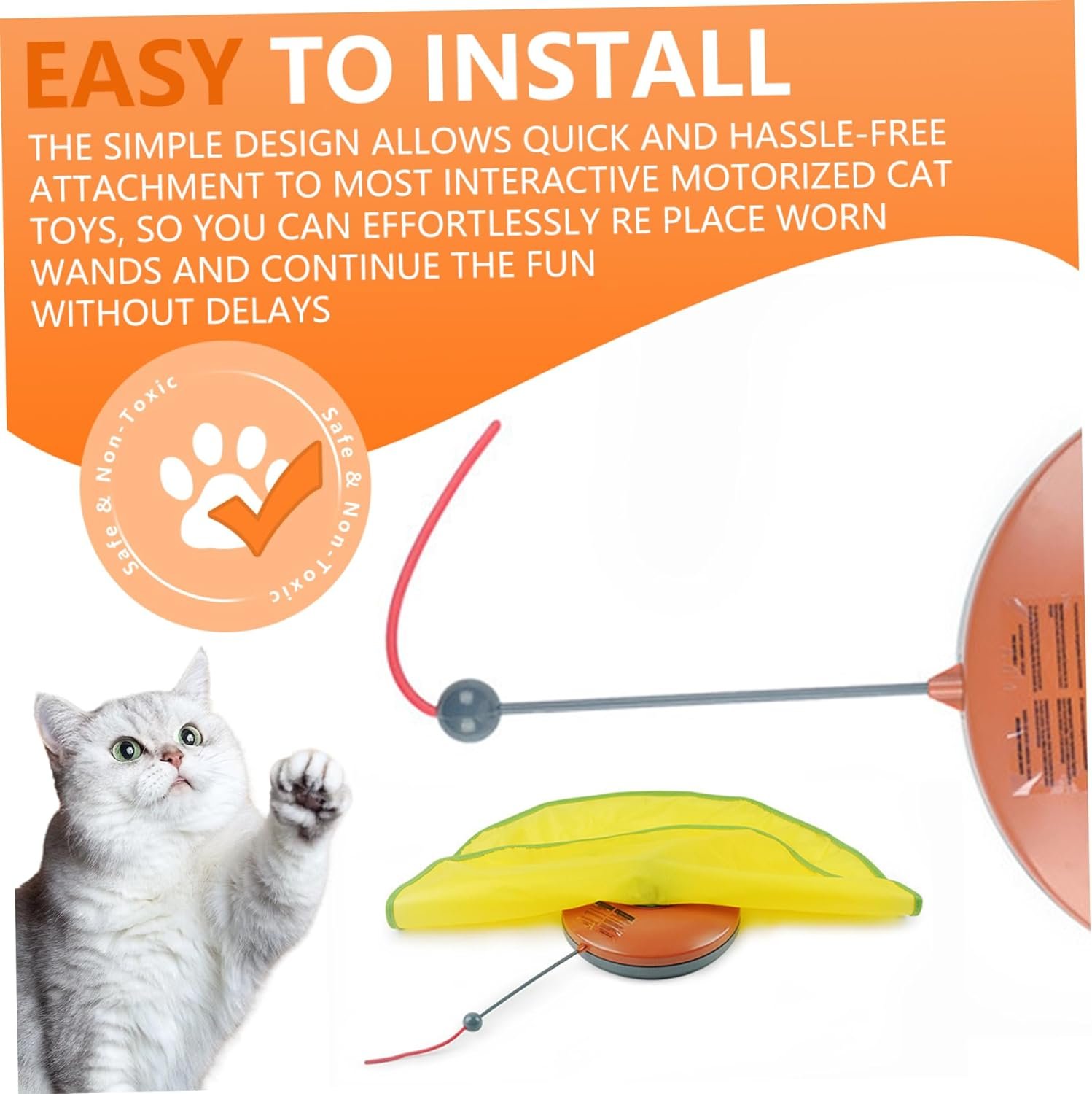 Easy to Install: The simple design allows quick and hassle-free attachment to most interactive motorized cat toys, so you can effortlessly replace worn wands and continue the fun without delays.