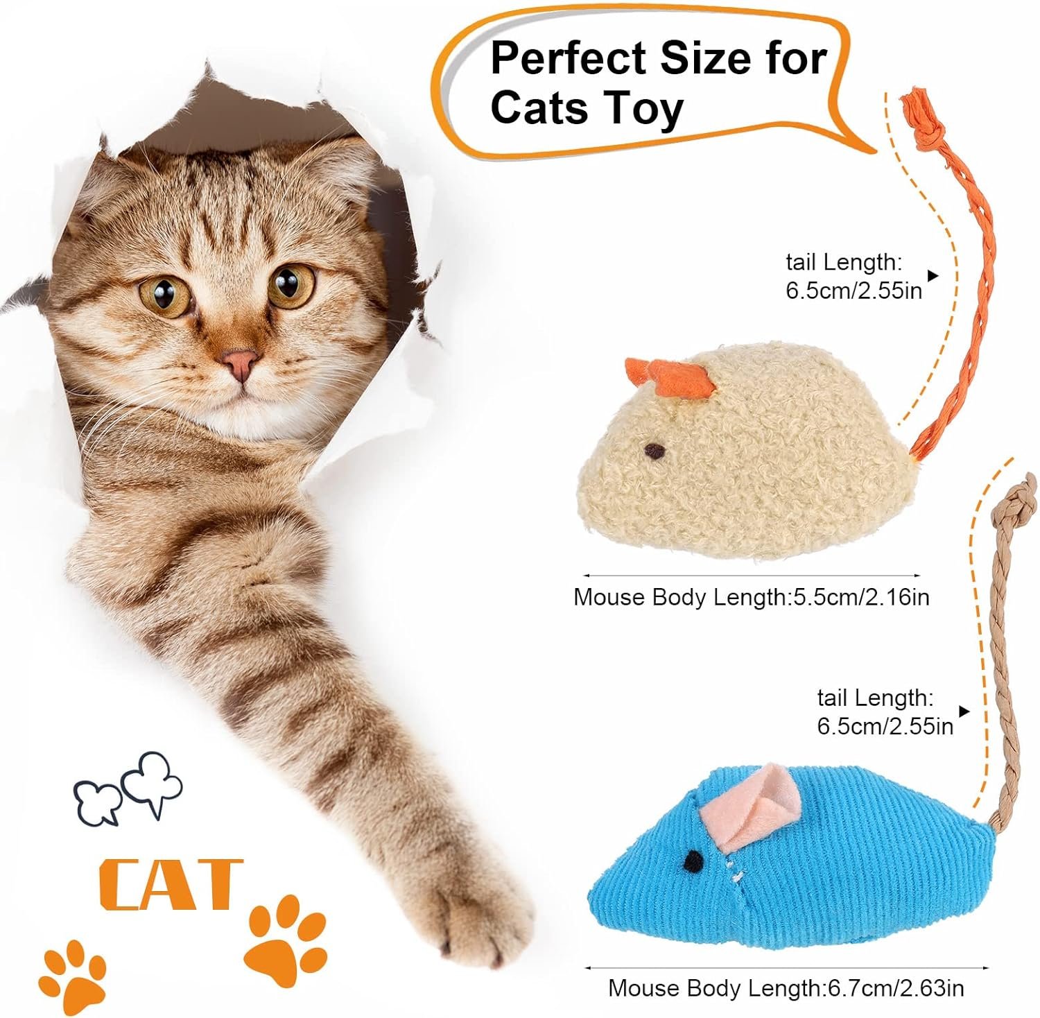 Realistic Small Mouse Size : 5.18 Inches from the nose tip to the tail tip, The cat toy mouse body is around 2.63 inches, This cat toy is sized similar to a real small mouse, easy for them to pick up and carry around the house.