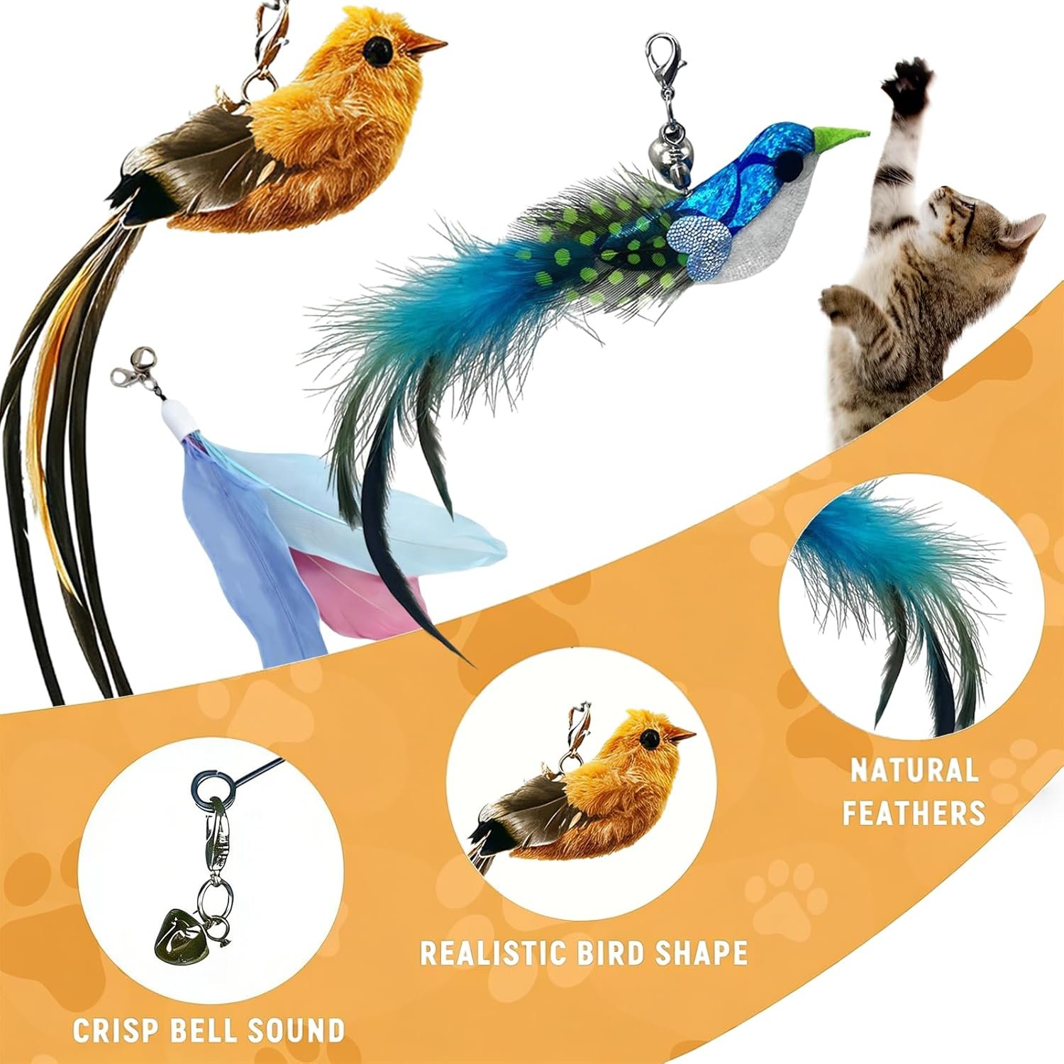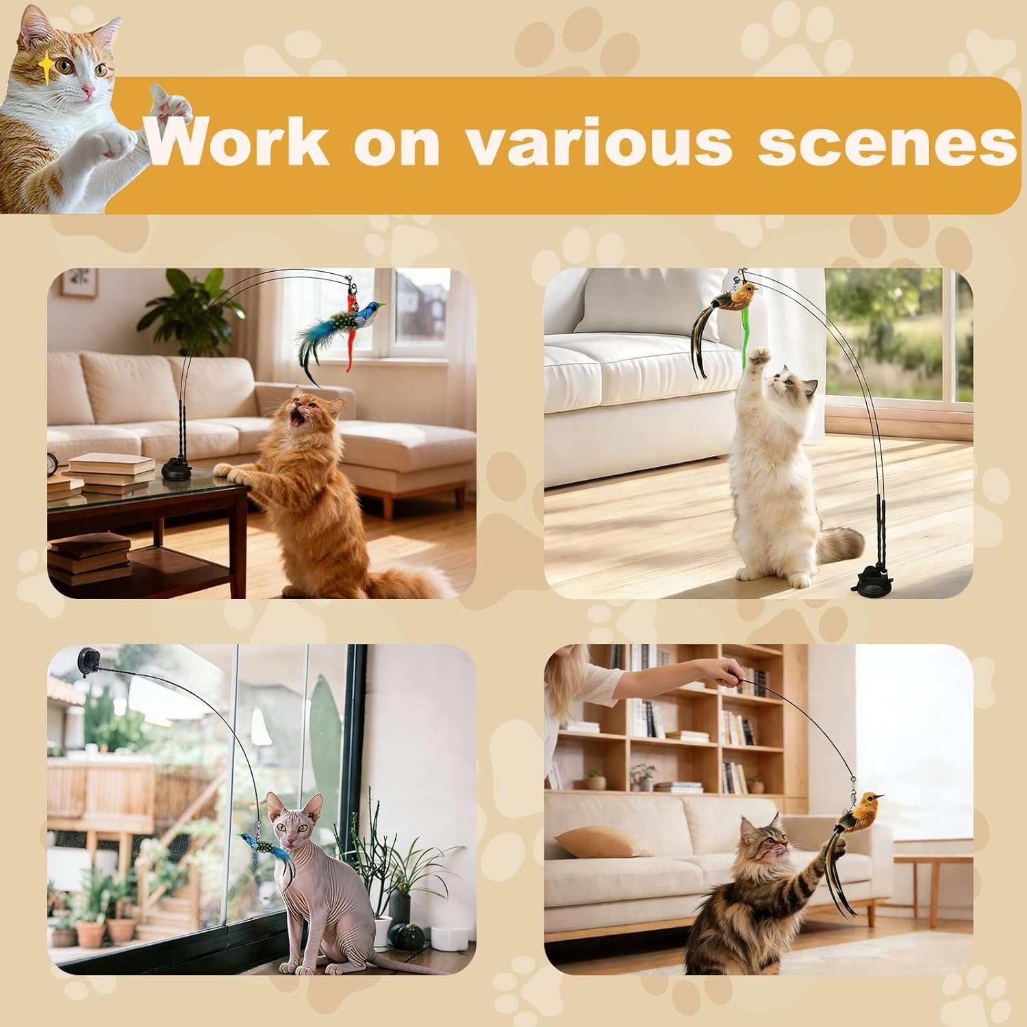 😸 【3-in-1 Interactive Cat Toy Set】 This set includes 1 suction cup base, 2 cat wands, 2 bird toys, 3 worm toys, and 1 feather toy. All accessories are interchangeable and designed to be durable, providing long-lasting entertainment for your cat.