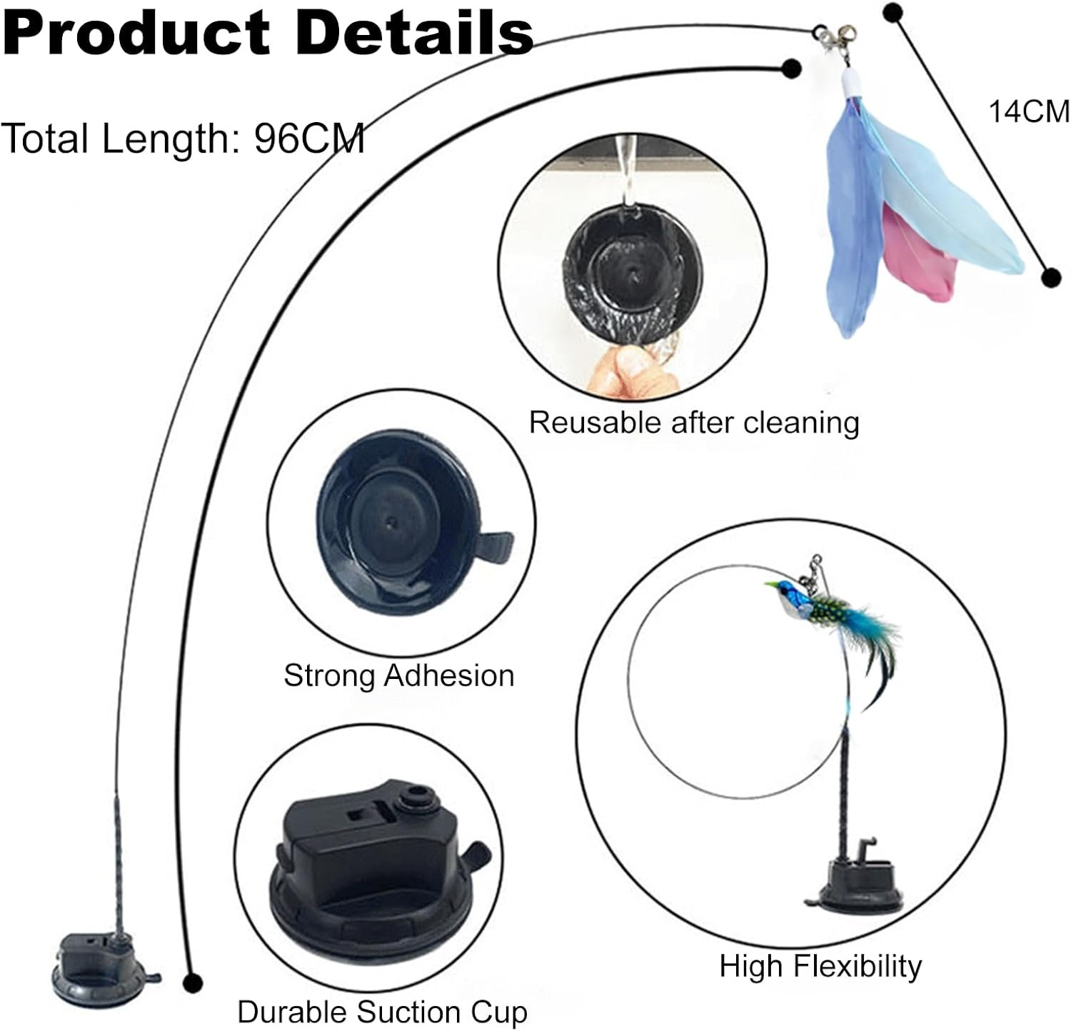 😸 【Two Play Modes for More Fun】 This versatile cat toy offers two ways to play: Use the wand to interact directly with your cat for bonding time. Attach the wand to the suction cup base to create a self-play toy with a bell, perfect when you’re busy or resting. It helps your cat stay active, stimulates both body and mind, and reduces excess energy.