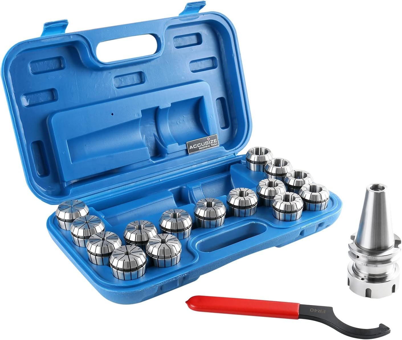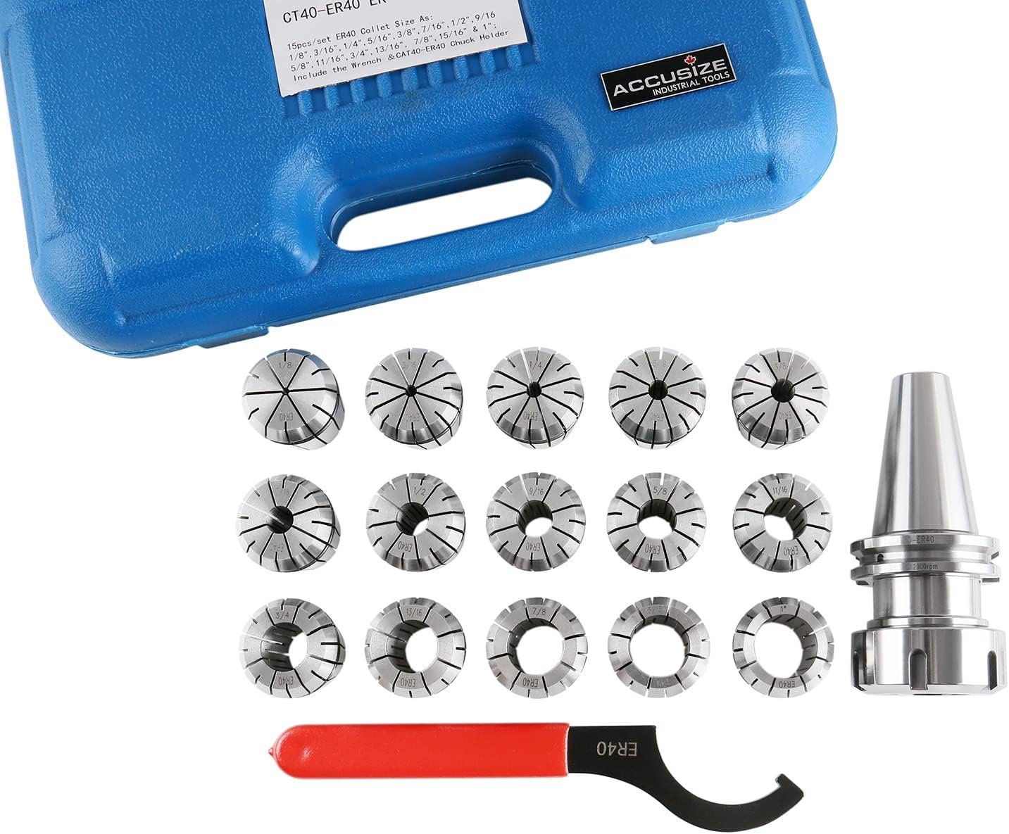 Accusize Industrial Tools Cat40 Shank and 15 Pc Er40 Collet Set with Wrench in Fitted Strong Box, 1/8 to 1 inch, Ct40-Er40