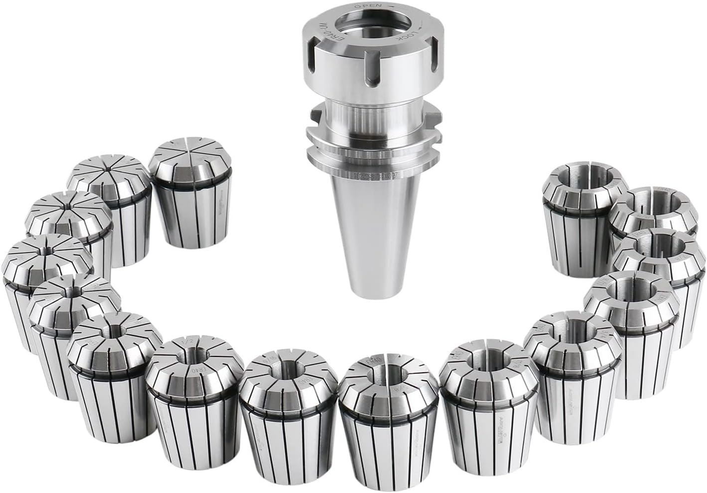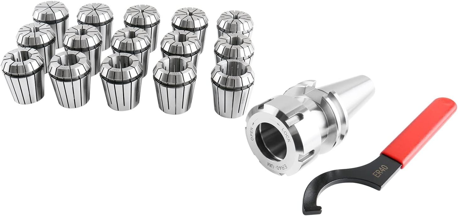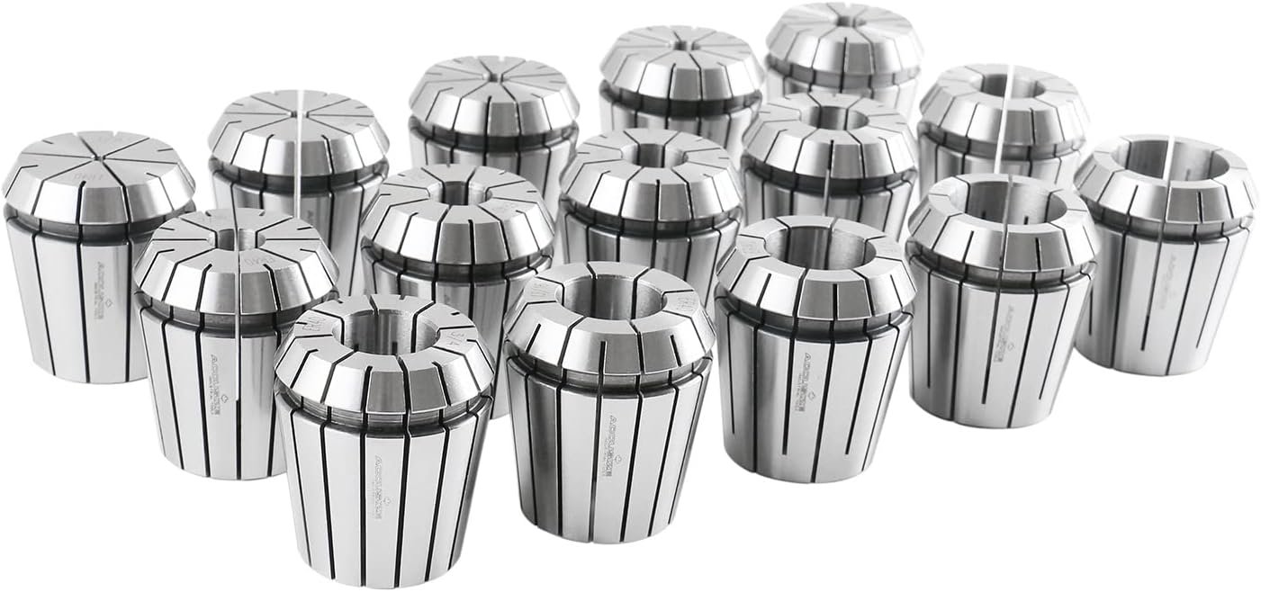 15 Pcs ER40 chucks set includes the following collet sizes: 1/8, 3/16, 1/4, 5/16, 3/8, 7/16, 1/2, 9/16, 5/8, 11/16, 3/4,13/16, 7/8, 15/16, 1″