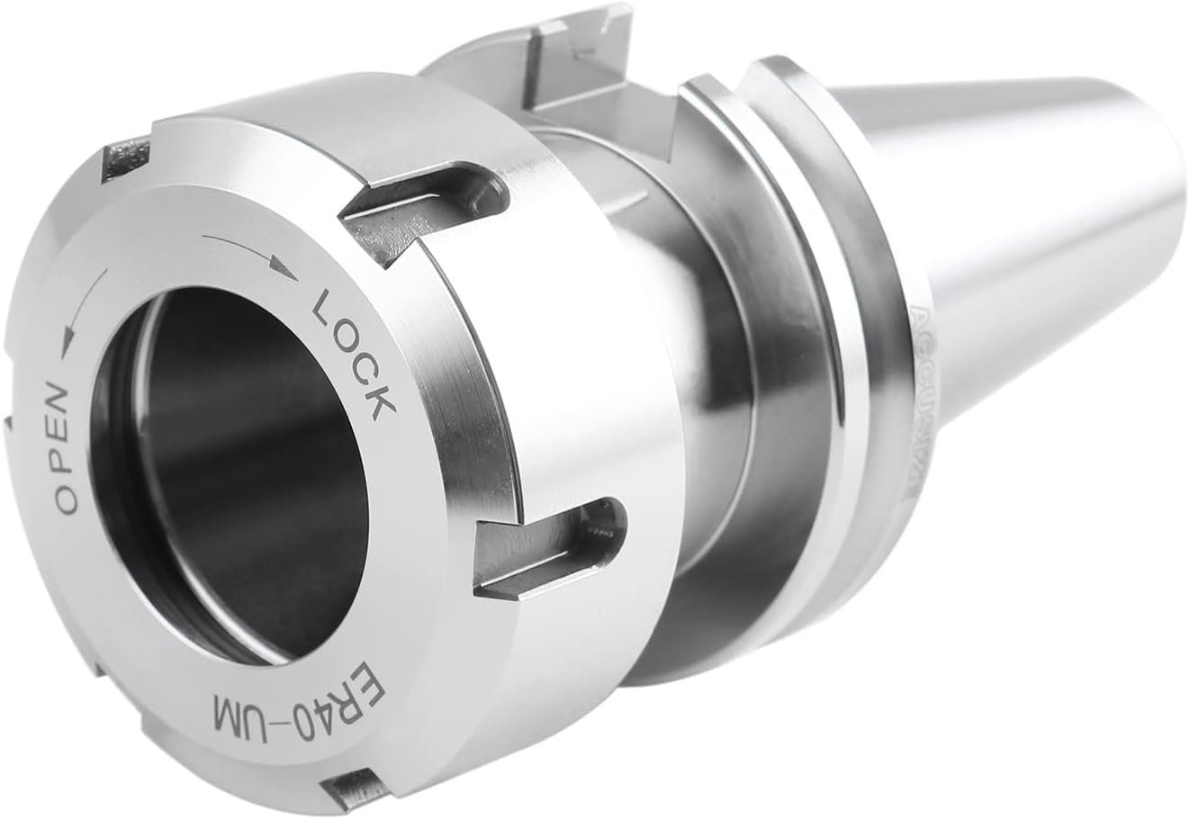ER40 collets, hardened to HRC 44–48, feature 0.0005″ runout and a specially treated surface that enhances durability and extends tool life.