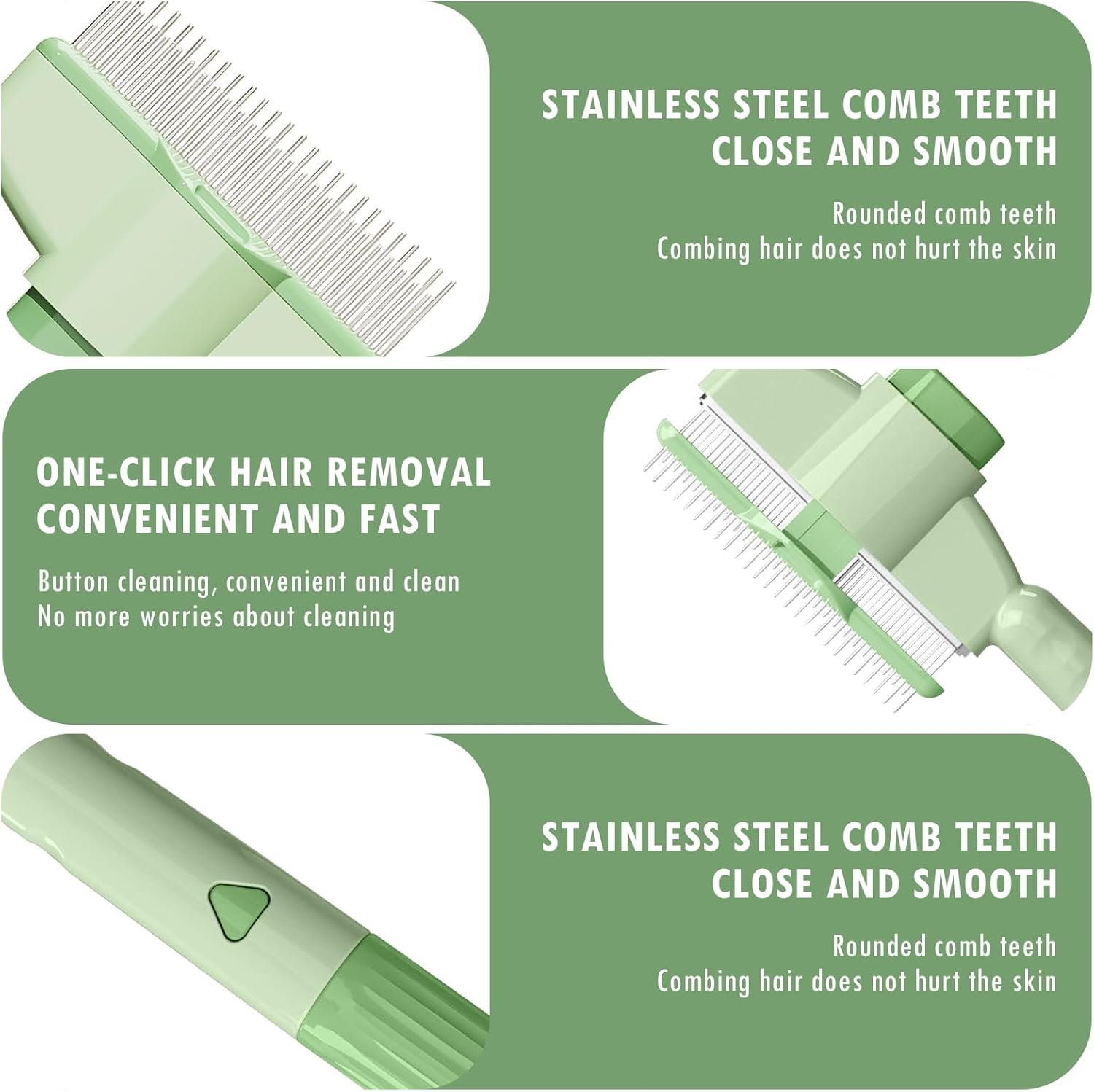 One-click Cleaning Button – After brushing your pet, simply click the button. The shutter will pop out, separating the brushed hair from the metal comb teeth, then wipe the hair off