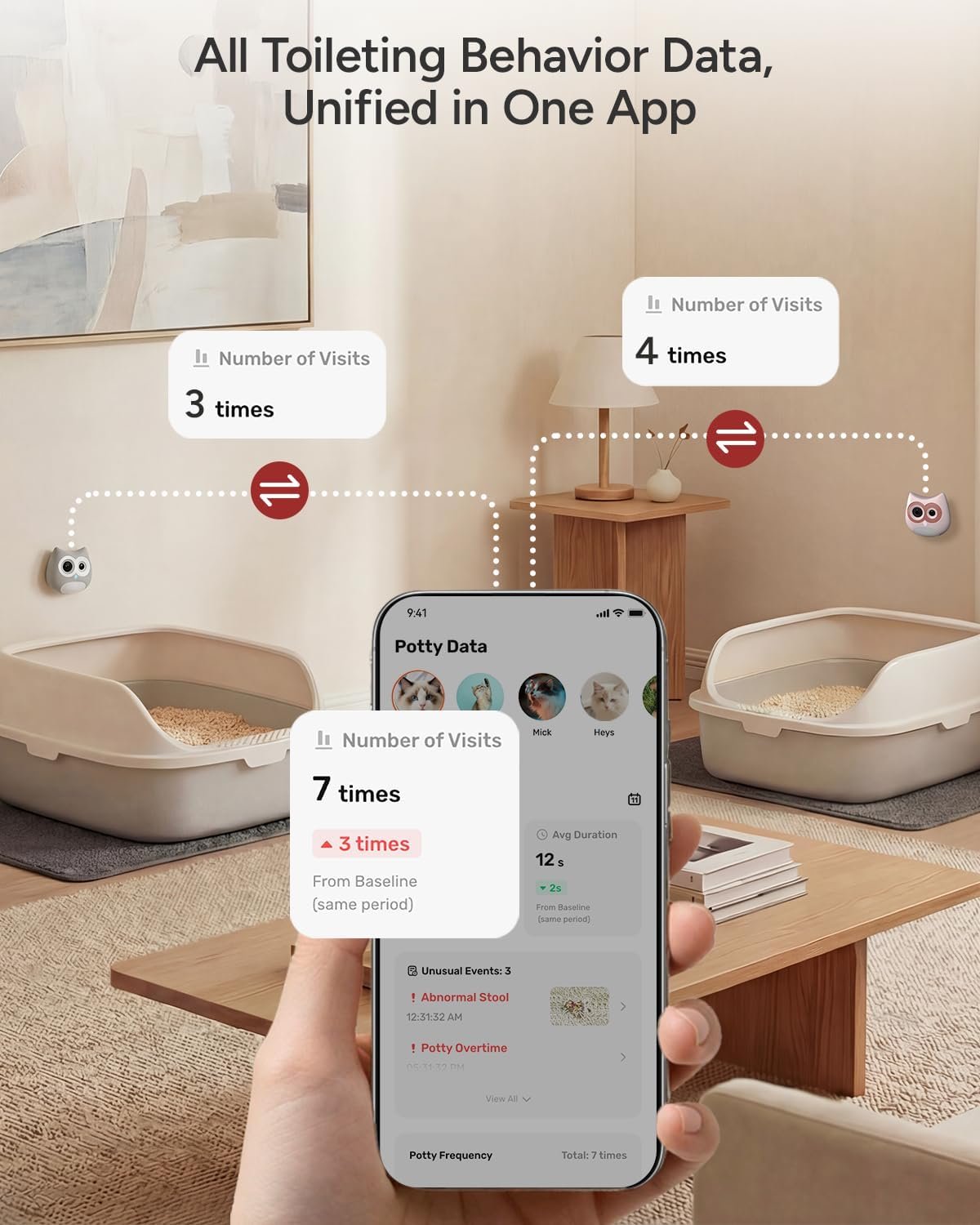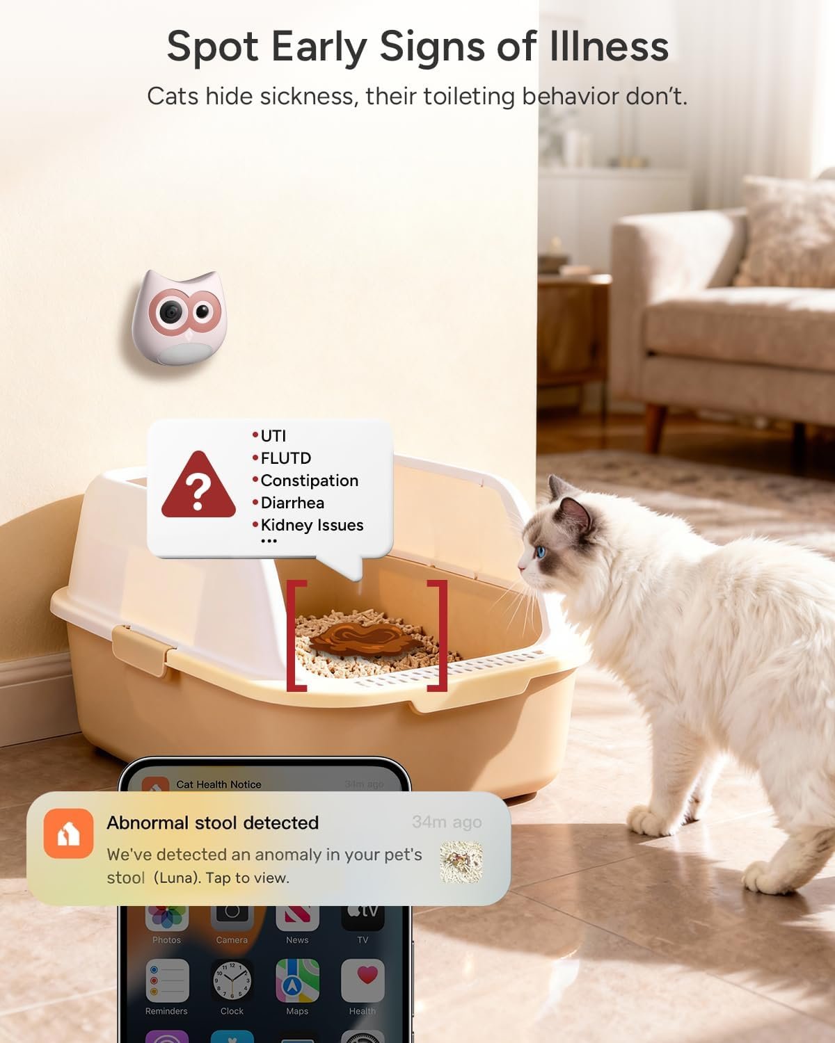 [Important Notice]: This device records your cat’s litter box activity and monitors stool color and shape, sending notifications when abnormalities are detected. Please note: it is not a professional medical device. If any unusual conditions are observed, consult a qualified veterinarian or professional promptly.