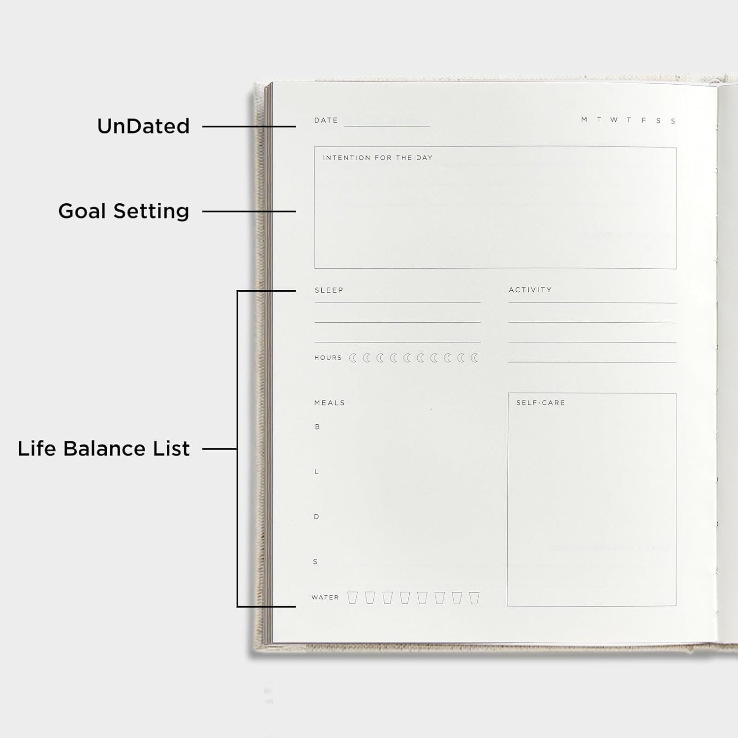The daily journal covers all aspects of physical and mental wellbeing: goal setting, gratitude, sleep, meals, fitness, self-care, inspiration and daily reflection, that will help you develop a habit of daily self-care. This undated planner lasts 3 months, so you can start anytime.