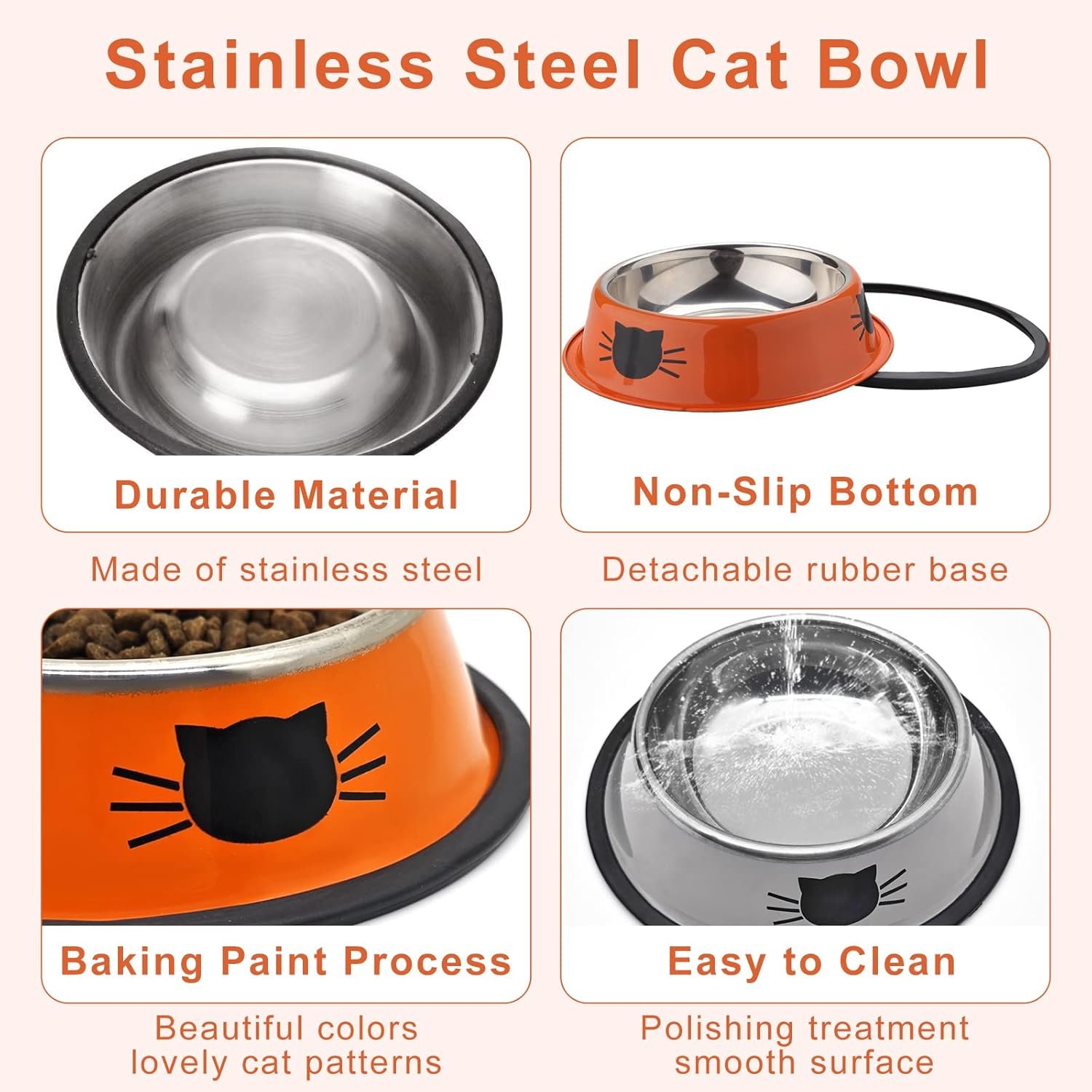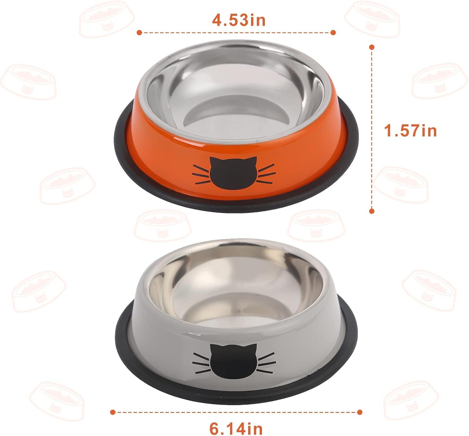 Andiker Cat Bowl for Food and Water, 2PCS Durable Stainless Steel Cat Bowl with Anti-Overturn Removable Rubber Ring Not Fragile&Easily Clean Cat Wet Food Bowl in Cute Pattern (Orange+Grey)