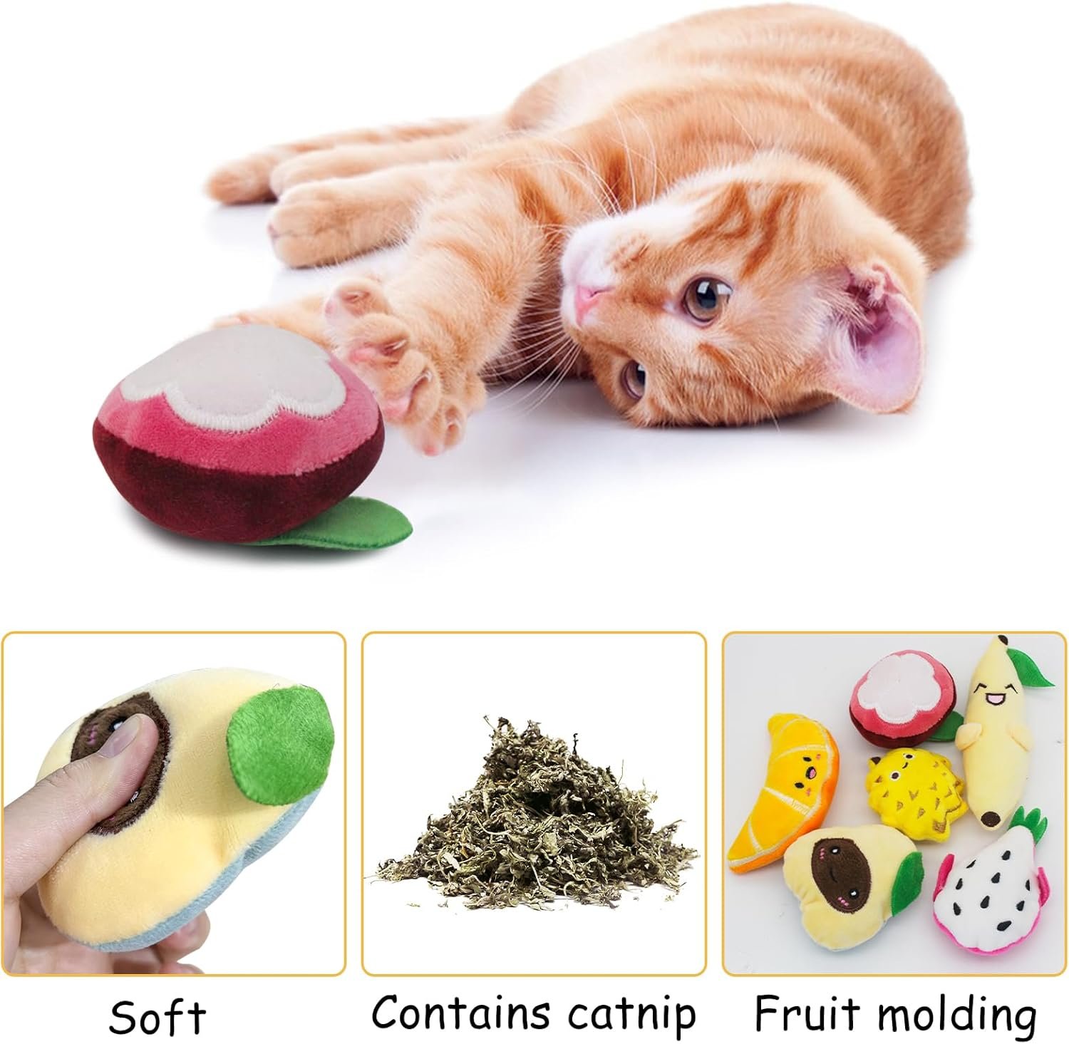 ✿【6Pcs Cute Fruit Shapes Cat Toy Sets】: You will get a 1-pack kitten toy with different cute fruit shapes, including 6 fruits: dragon fruit, mangosteen, orange, avocado, durian, and banana. Different fruit shapes can better attract your cat’s eyes, arouse the cat’s curiosity, and let your cat play and enjoy a relaxing playtime.