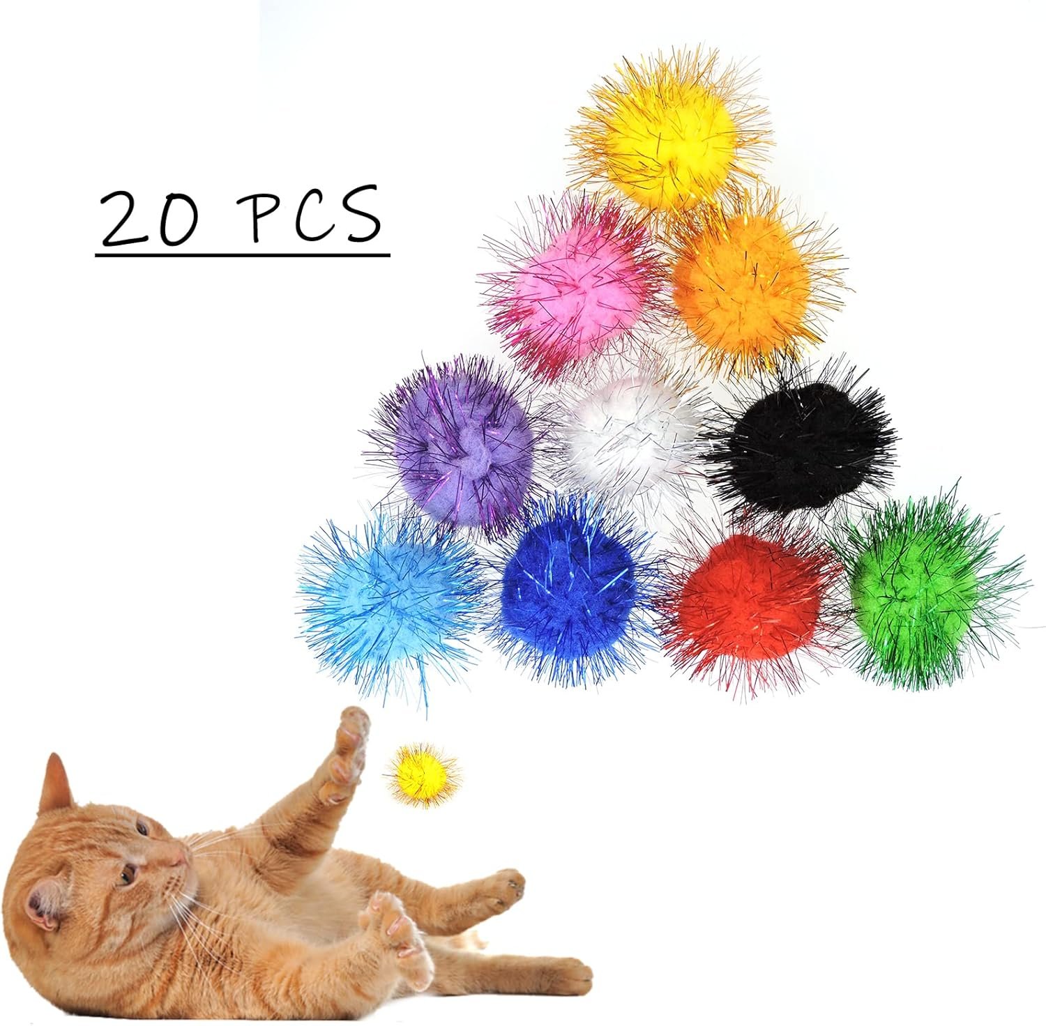 Shiny Glitter Balls-Inspire Cat’s Interests: Cats like bring colors and our kitten toys in bright tinsel colors. 20pcs shiny and reflective cat sparkle balls can be good choice for your cats