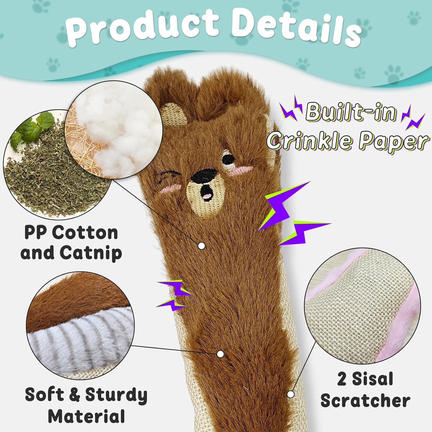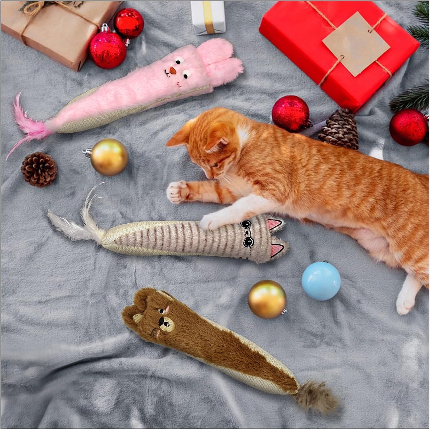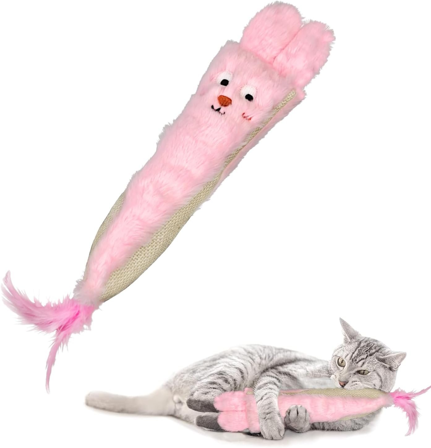 Andiker Cat Toys for Indoor Cats,10.24in Plush Catnip Toy with Crinkle Paper Inside,Fluffy Interactive Cat Toy with Feather and 2 Sisal Scratchers for Biting, Chewing, Scratching and Kicking