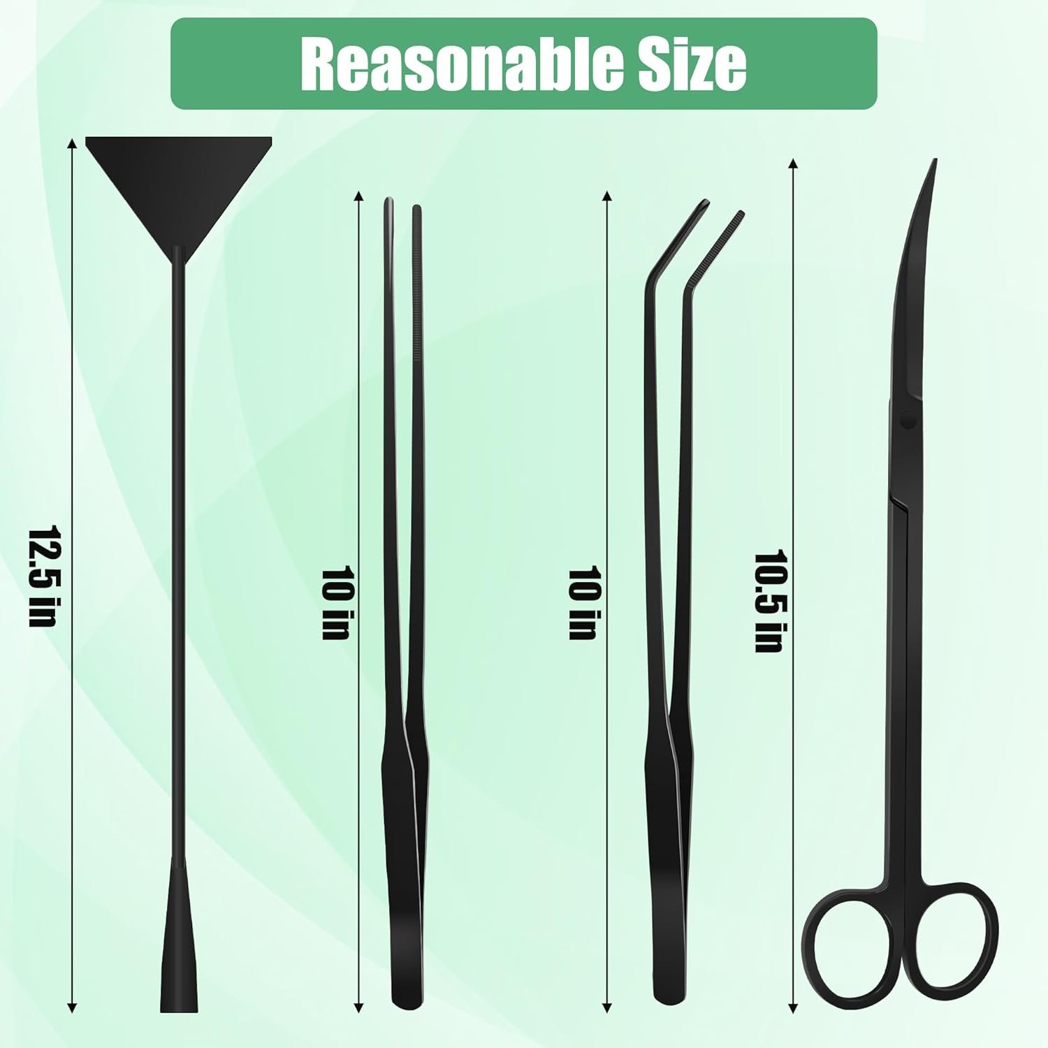 4 in 1 Aquascape Tools Kits: Aquarium tank aquascape tools kits including 1*10.5″ curved scissors, 1*10″ straight tweezers, 1*10″ curved tweezers, 1*12.5″ sand spatula, one kit, multi-function.