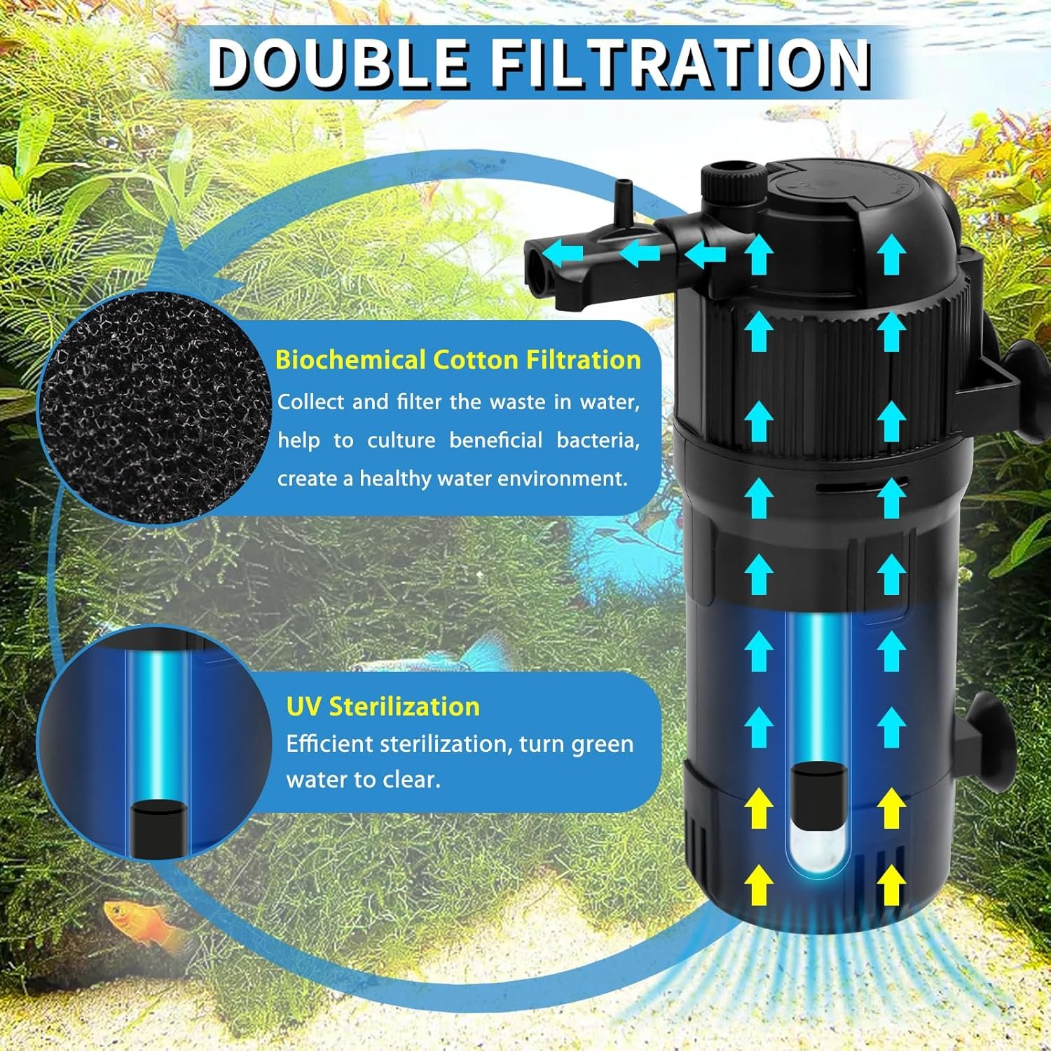 【Double Filtration】This biochemical cotton inside the filter can collect and filter the waste in water, create a healthy water environment for your fishes. The biochemical cotton is washable and reusable. The U-V lamp provides secondary filtration, turns the green water super clear. (PS When the U-V light is on, a small amount of internal light can be seen through the cutout at the bottom of the filter.)
