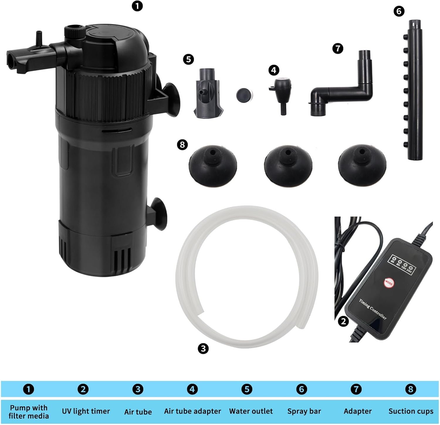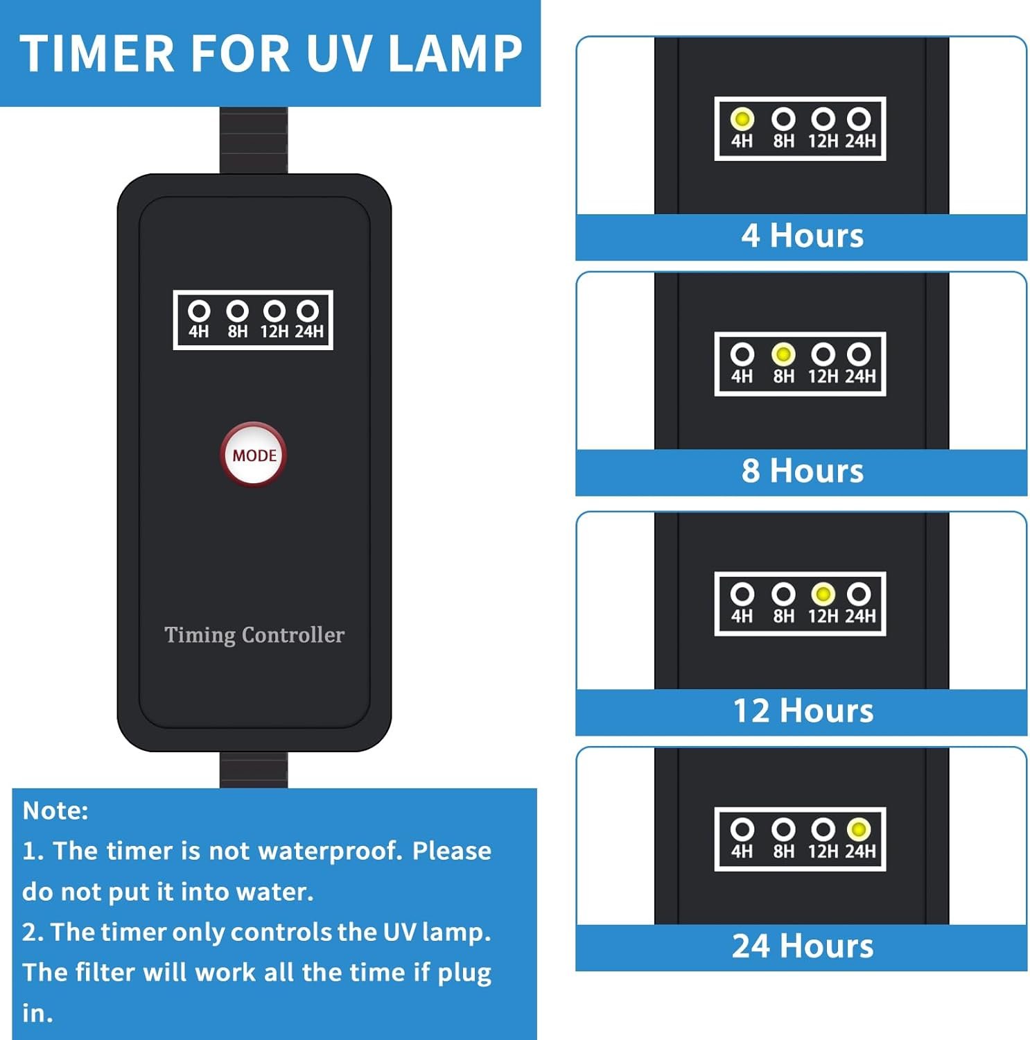 【Timer for U-V Light】A timer, which controls the U-V lamp to turn on at the options of every 4 hours, 8 hours, 12 hours, or 24 hours, provides you great convenience as it is not necessary to have the lamp on all the time. PS: The timer can only control the U-V lamp, not the water pump.