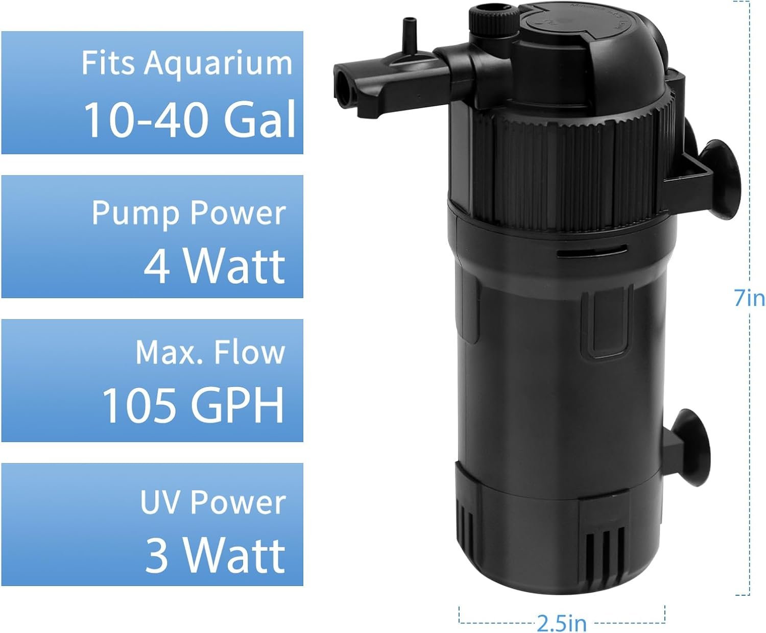 【For Small & Medium Tank】This aquarium filter is suitable for fish tanks of 10 to 40 gallon. Filter Dimension: 7”(H) x 2.5”(L) x 2.5”(W)