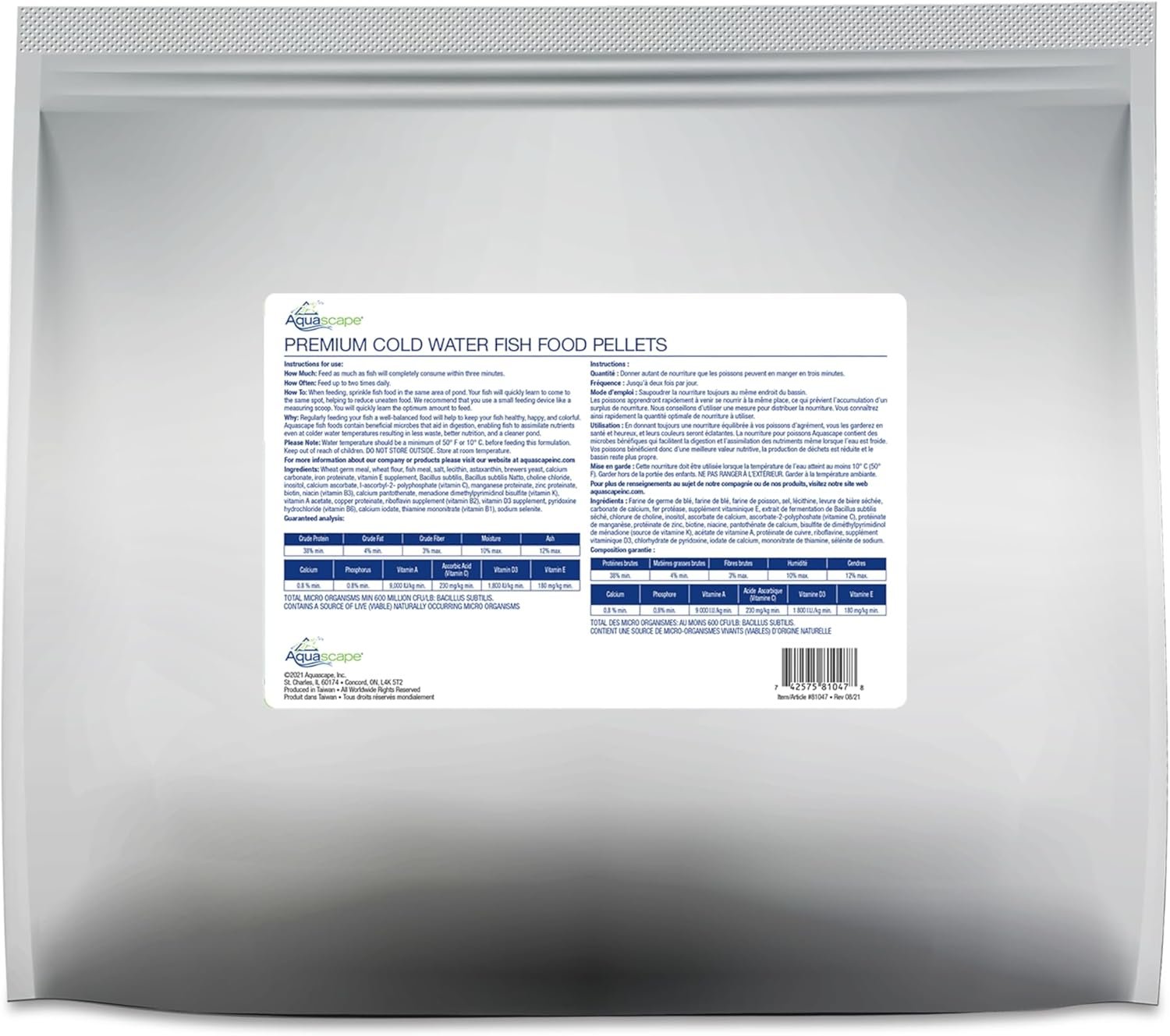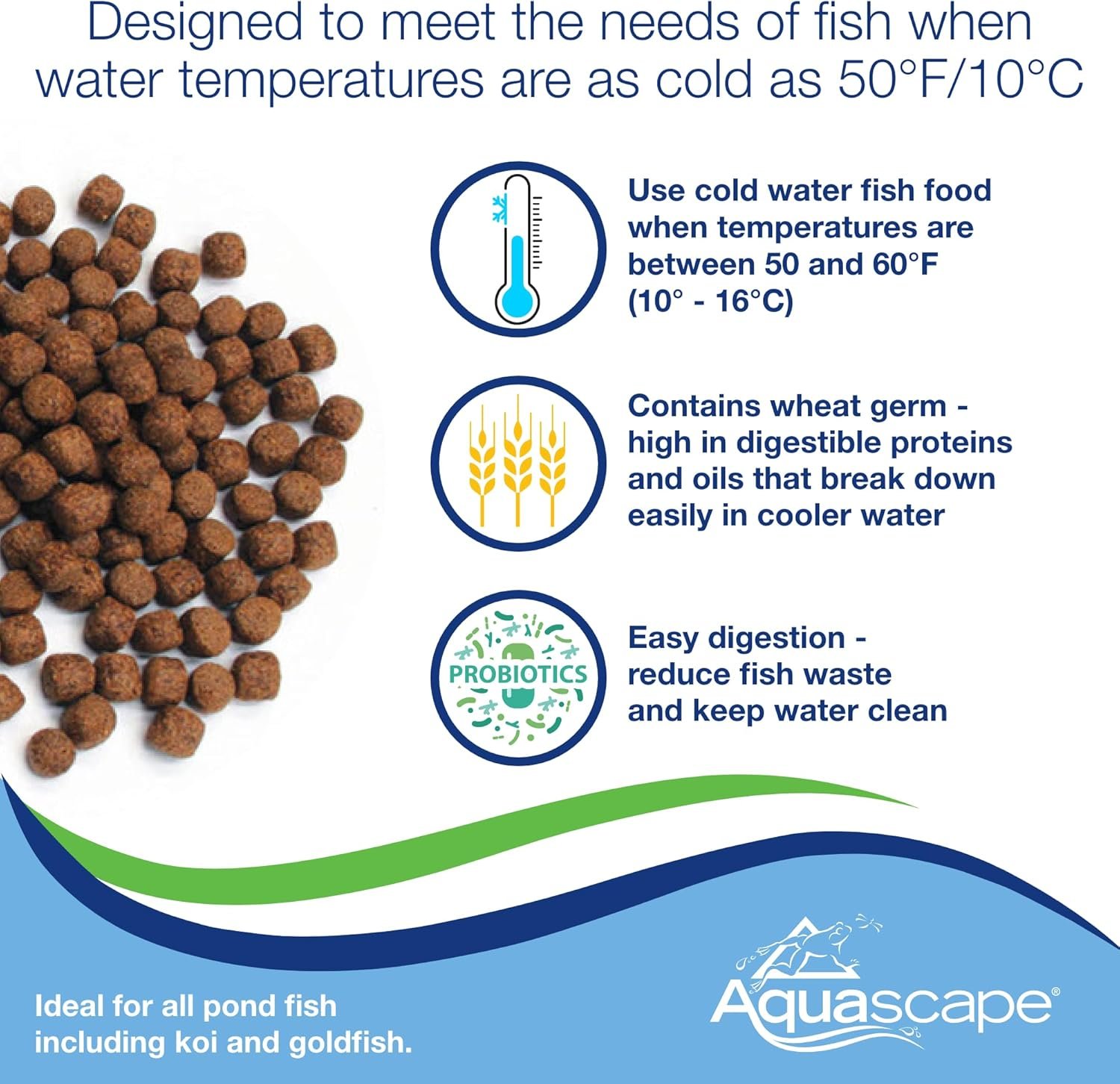 If you want happy and healthy pond fish, you need to feed them a high-quality fish food. Aquascape Premium Cold Water Fish Food Pellets are specially formulated for cold water conditions and provide your pond fish with the nutrition they need to thrive at an affordable price. Our cold water fish food contains wheat germ, making it ideal for use in water as cold as 50 degrees Fahrenheit. All Aquascape fish foods contain probiotics that aid in digestion and reduce fish waste, while the high-quality protein included helps to optimize growth rates. The floating pellets contain stabilized vitamin C and other quality ingredients and are scientifically formulated for all pond fish, including koi and goldfish. Aquascape fish food will not break apart during feeding, helping to maintain clear water conditions.