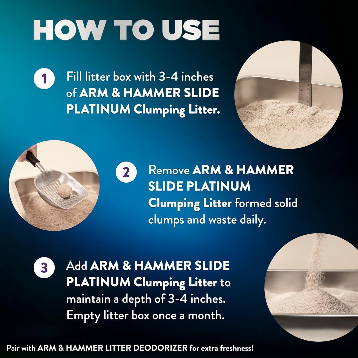 7-DAY ODOUR-FREE HOME, GUARANTEED; Slide cat litter is a complete odour-sealing, odour control cat litter with powerful odour eliminators plus Baking Soda; Guaranteed odour control for 7 days; An odour-free home starts with ARM & HAMMER
