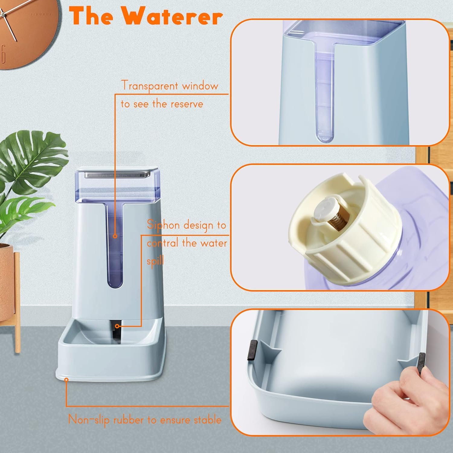 The screw cover the bottle of the dog water bowl dispenser is made of siphon design. When the water in the dog water bowl reaches a certain height, the spring device which on the cat water dispenser will close and the water stops flowing automatically.