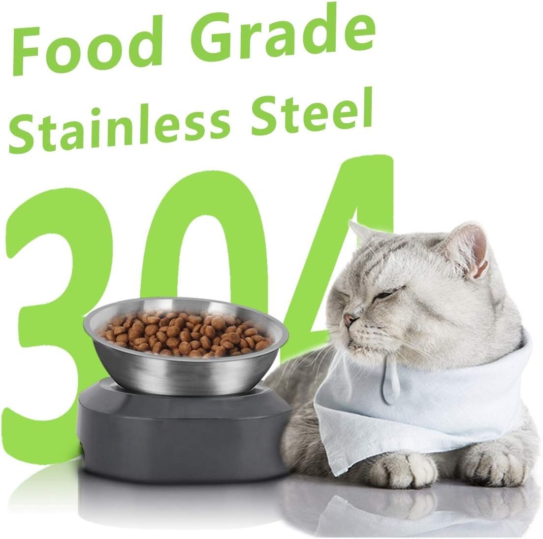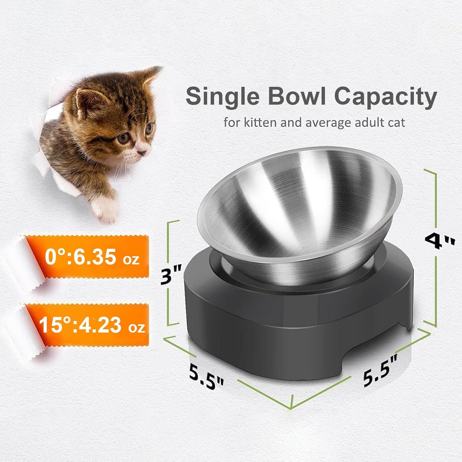 ADJUSTABLE ANGLE & REMOVABLE FOR EASY CARE: The stainless steel cat dish offers 0° and 15° two-angle options, easily rotated to suit your pet’s preference. It detaches from the base with a simple twist for effortless rinsing of food residue or dishwasher cleaning.