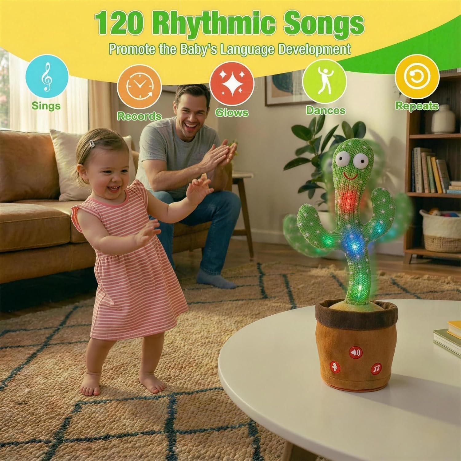 DANCING BABY TOYS: Talking cactus baby toy comes with 120 cheerful audio clips. It dances happily and glows confidently while playing music. Features clear recording for up to 15 seconds. Great birthday, Easter gifts for baby kids girl boy